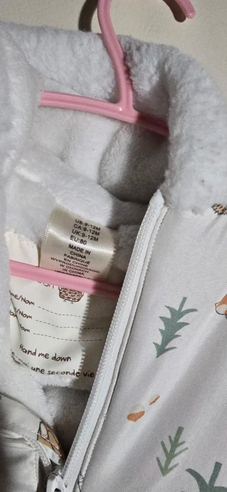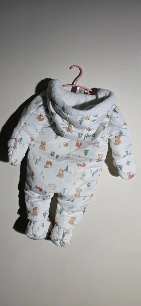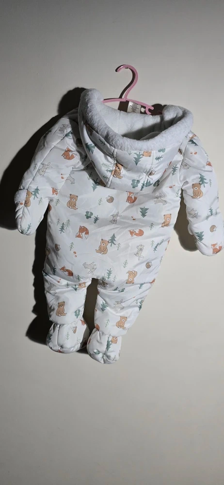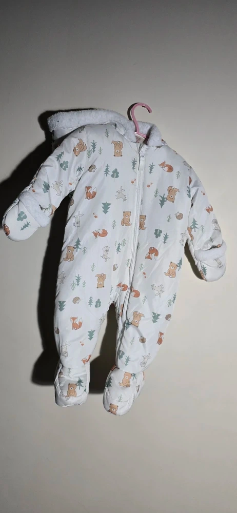 This adorable First Wish snowsuit is perfect for keeping your little one warm this winter! It's sized 9-12M and features a cute animal and tree print. It has a cozy, soft lining and a hood to protect from the elements. It's in great condition and ready for a new home!