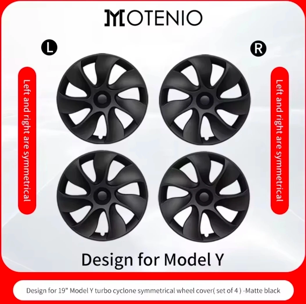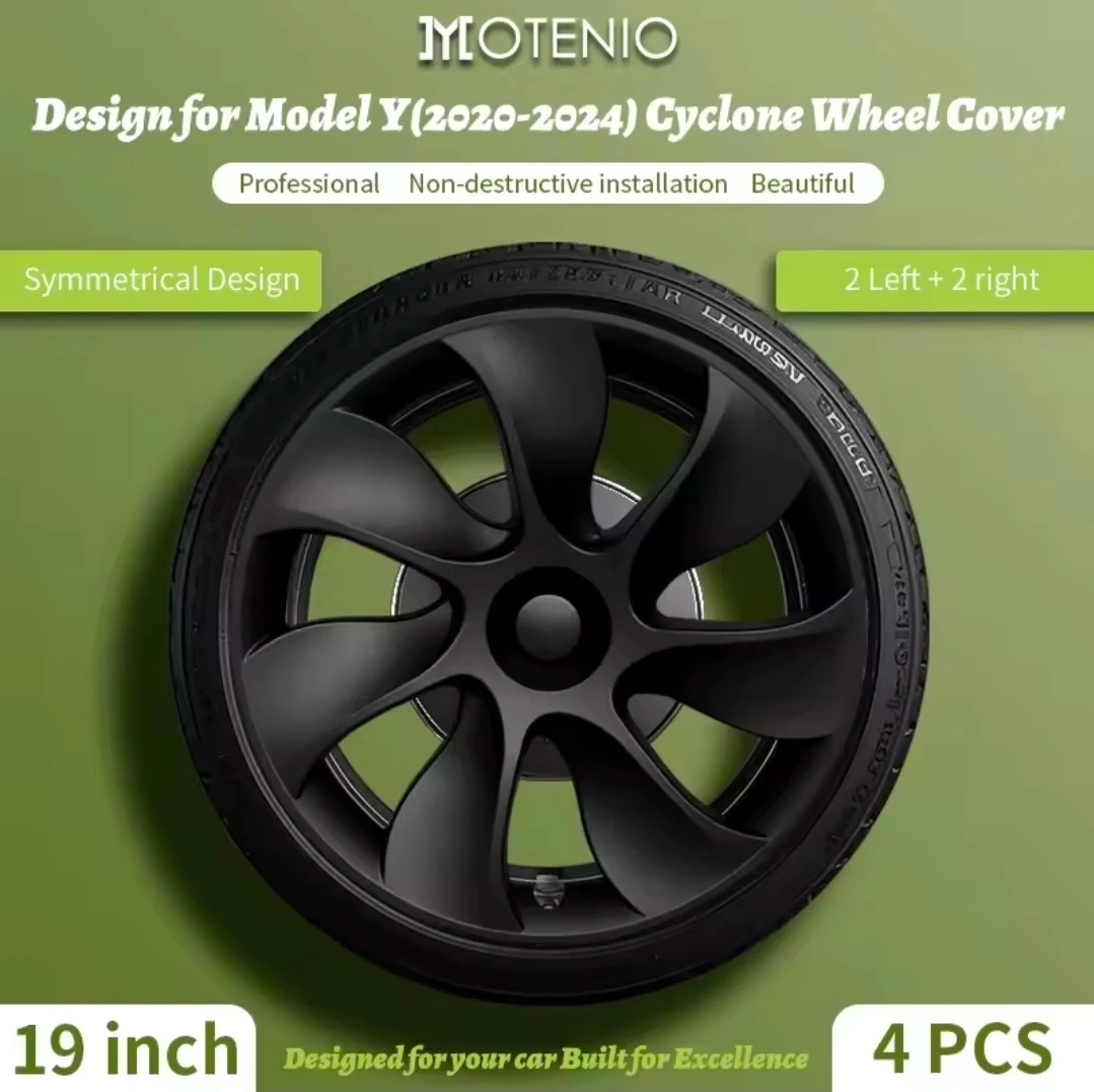 Selling a set of four MOTENIO cyclone wheel covers designed for the Tesla Model Y (2020-2024) model. These are 19-inch matte black wheel covers featuring a unique left-right symmetrical design for a professional, non-destructive installation. Please verify that your vehicle model is compatible with the product before purchasing. Not suitable for Model 3 Highland (2023-Present), Model 3 (2017-2023), or Model Y Juniper (2025-Present).