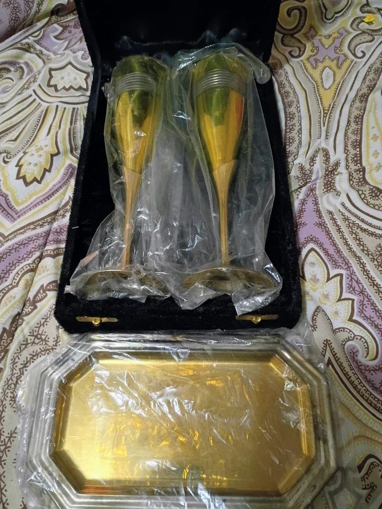 Here are two gold champagne flutes in their original case. They come with a tray as well. These are perfect for adding a touch of elegance to any celebration! They are in great condition and ready to sparkle at your next event