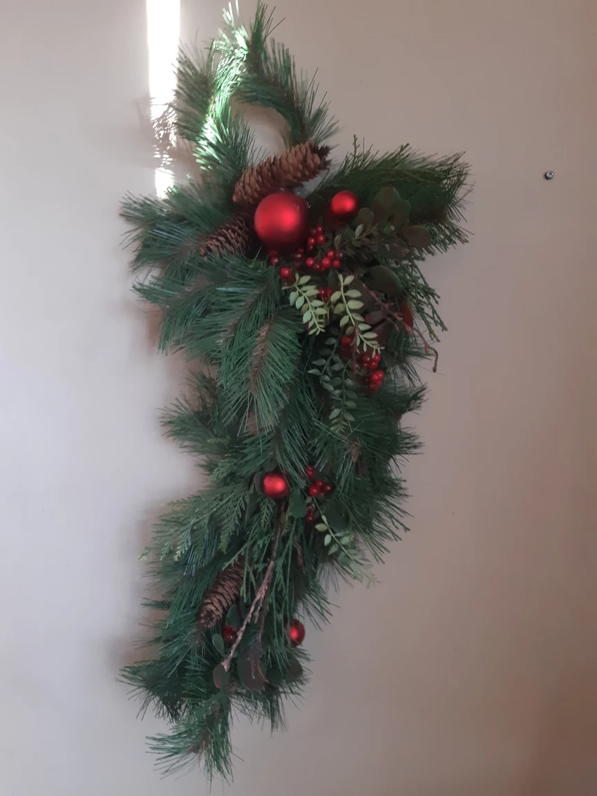 A festive Christmas pine swag, perfect for adding a touch of holiday cheer to your home! It features realistic-looking pine needles, pinecones, and bright red ornaments