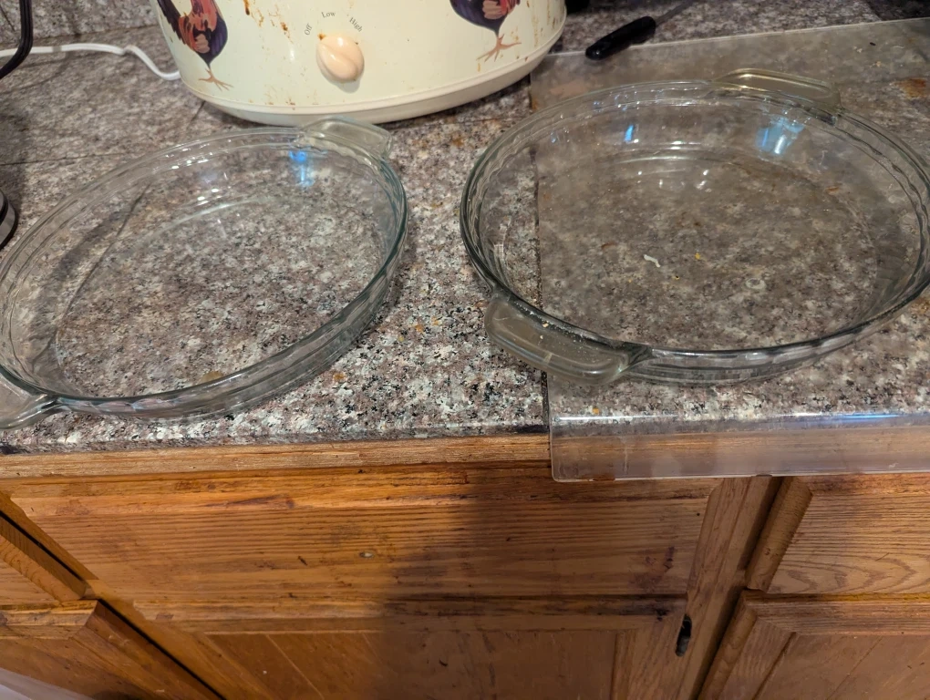 Selling two clear glass baking dishes. One is round and the other is oval shaped. They're in good used condition and ready for your next baking project!
