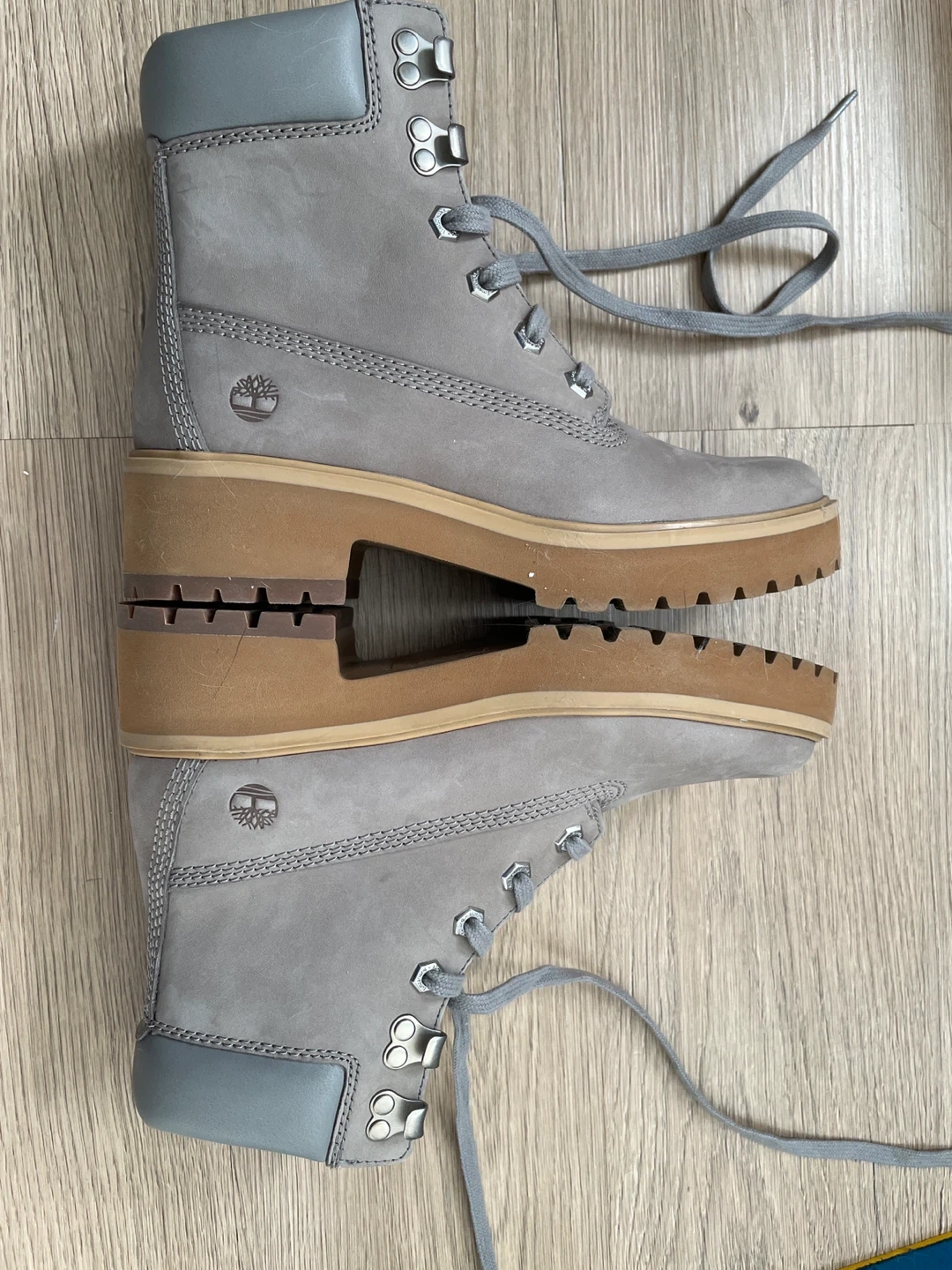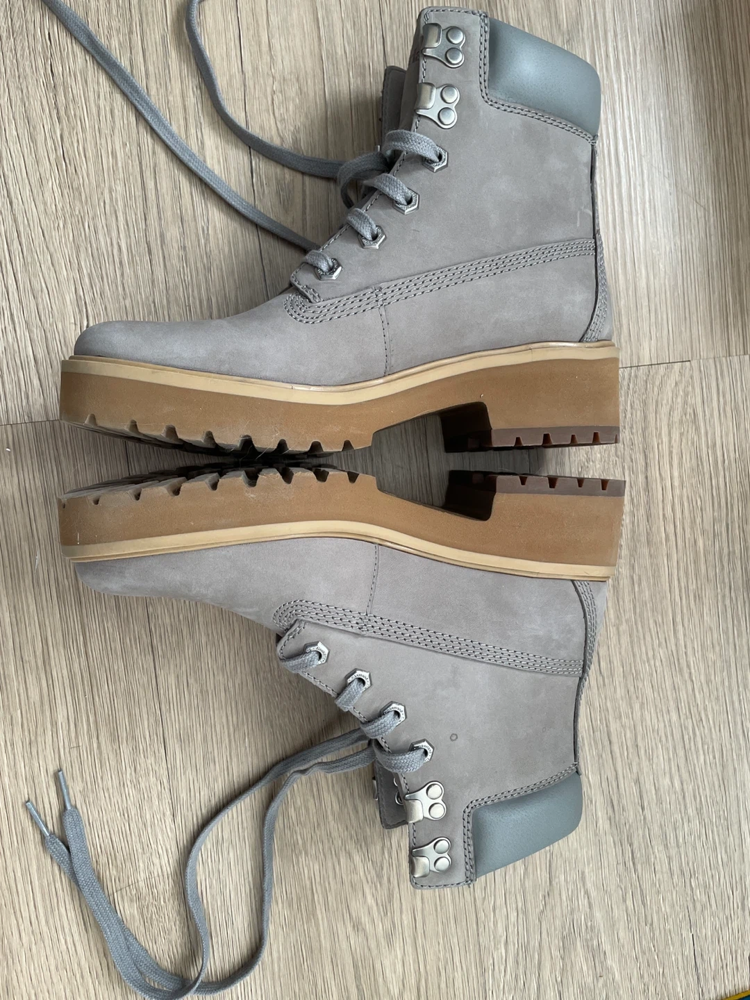 Selling a pair of Timberland boots in a stylish grey leather! They're in great condition and ready for a new home. Perfect for adding a touch of ruggedness to your look!