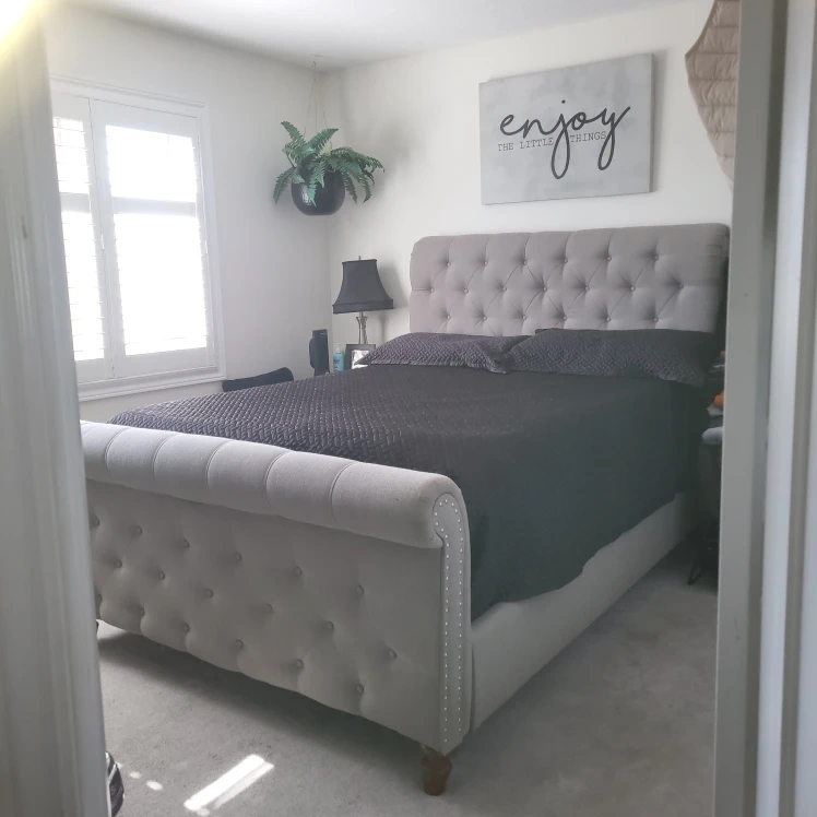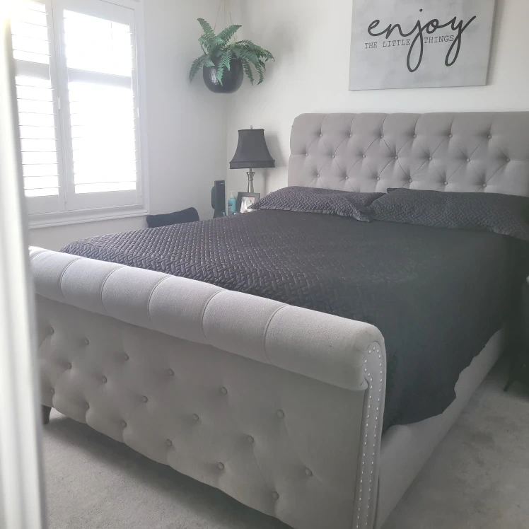 Selling a queen-size upholstered sleigh bed frame. It's in great condition and would look lovely in any bedroom. The headboard features button-tufted detailing, adding a touch of elegance to your space