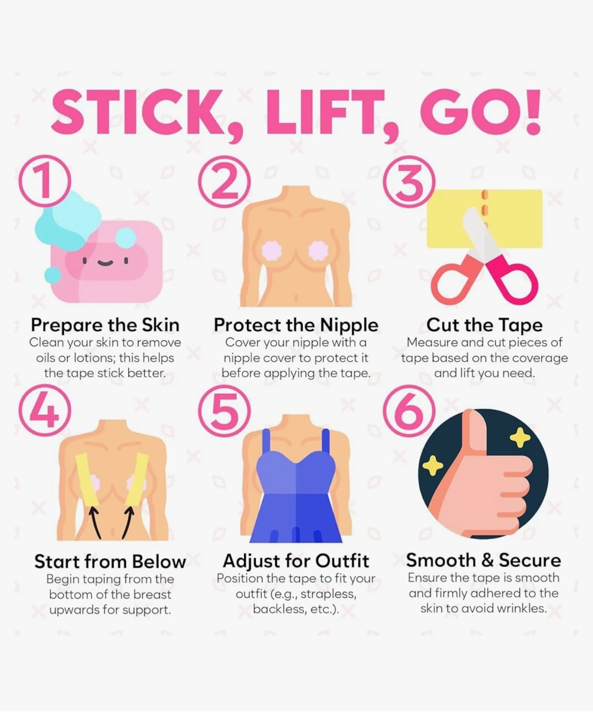 Boob tape is latex free, customizable, breathable, sweat proof, easy to use/remove and skin/fabric friendly. Gives you a full support, enhances cleavage and holds securely in place and invisible under clothes. Gives you flexibility to wear it under any outfit and customize it to your liking, providing full support and no visible straps showing.
