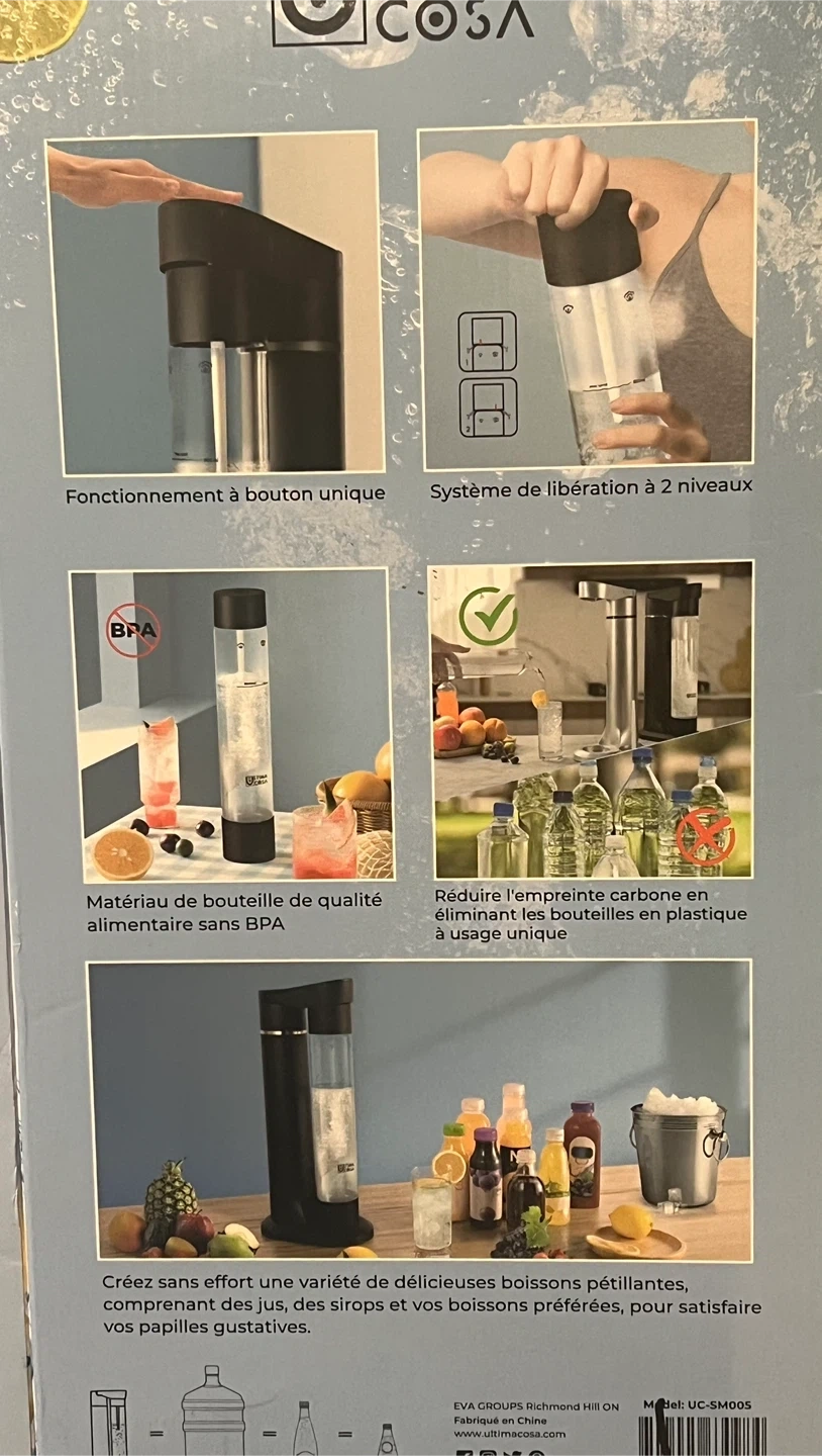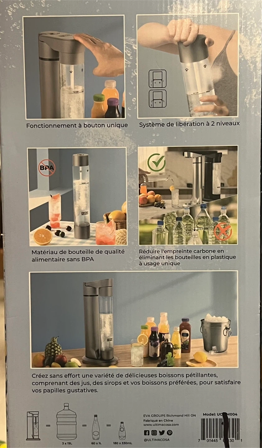Get fizzy with this Ultima Cosa Presto Frizzante Soda Maker! It's perfect for making your own sparkling water and delicious beverages at home. It features a one-button operation and a 2-level release system. It comes with 1 BPA-free water bottle (1L) and 1 BPA-free water bottle (550ml), as well as a 60L CO2 cylinder. It is available in silver.
