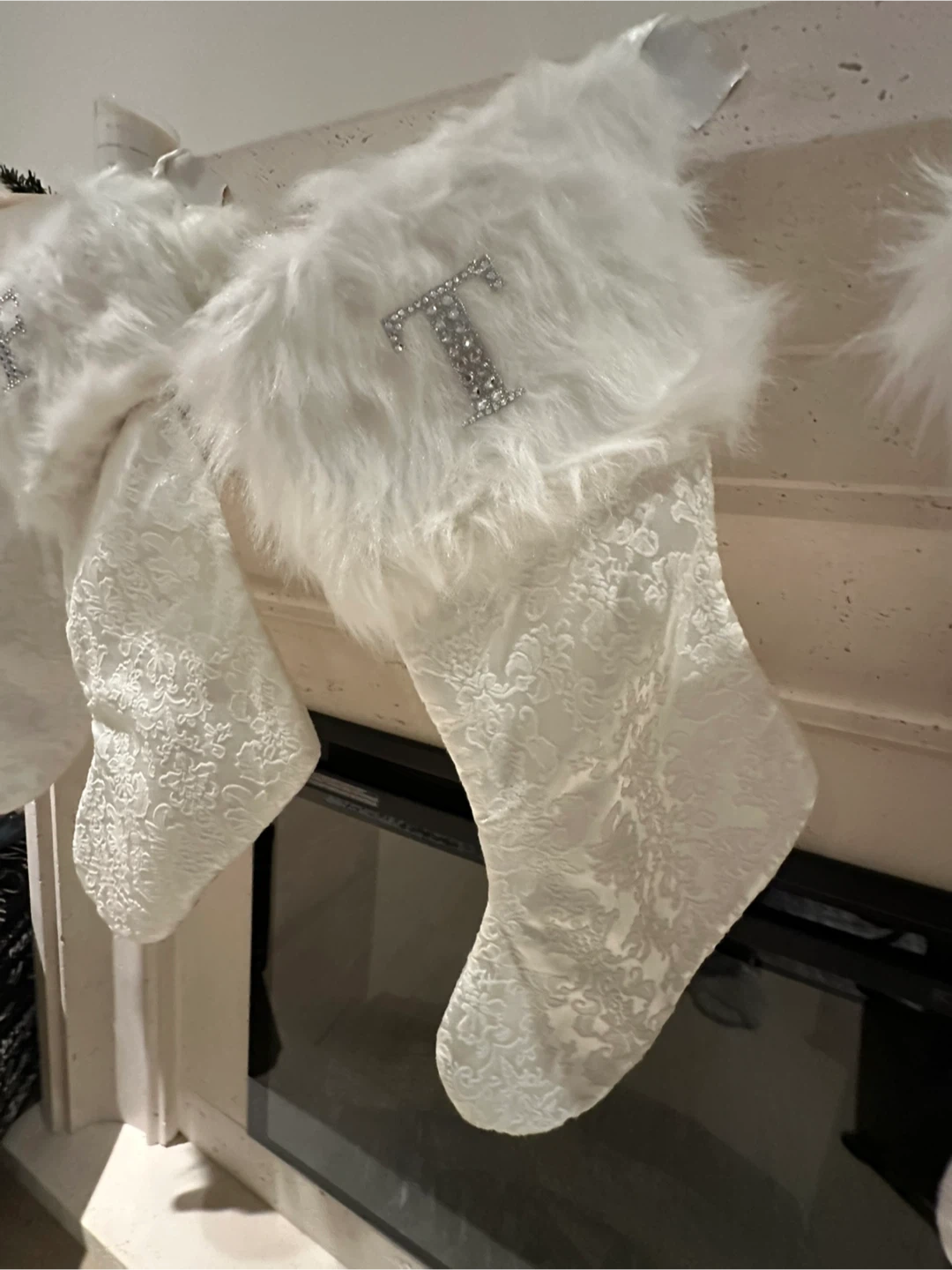 Selling a set of five lovely white Christmas stockings! They feature a delicate lace pattern and fluffy white cuffs, each adorned with a different initial in sparkly rhinestones. Perfect for adding a touch of elegance to your holiday decor.