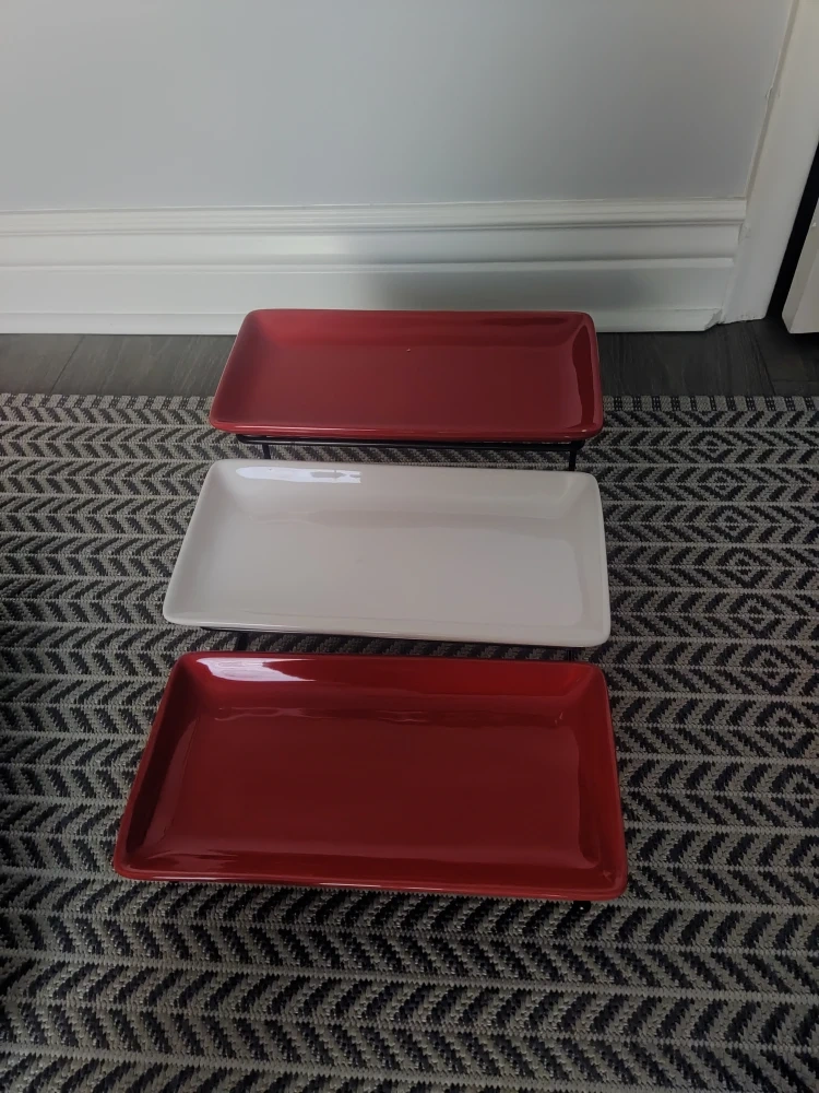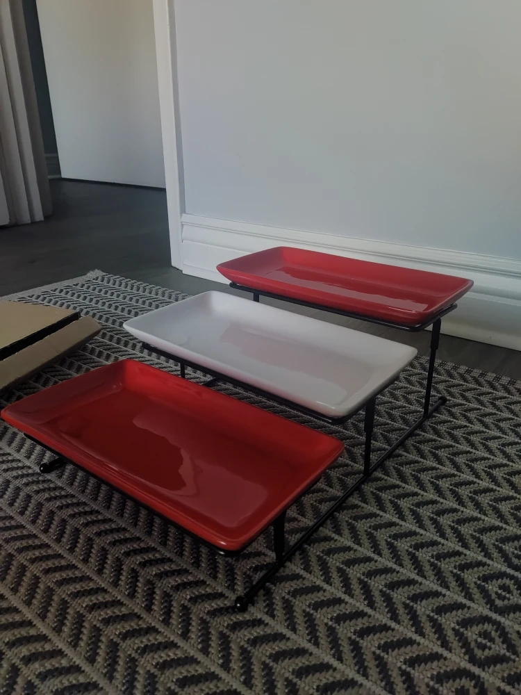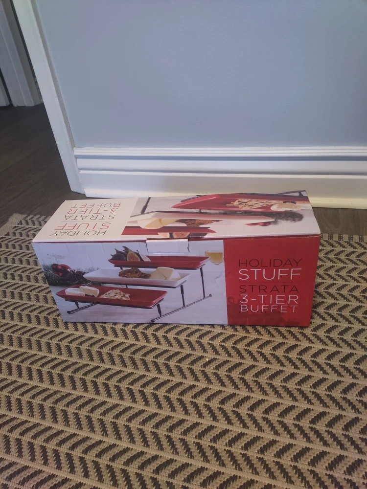 Selling a Holiday Stuff Strata 3-Tier Buffet Server! It’s perfect for entertaining during the holiday season or any time you want to serve appetizers, wine, cheese, or delicious desserts. The durable ceramic platters sit securely on the dark metal stand, making for the perfect display for your holiday treats. The box is included too!