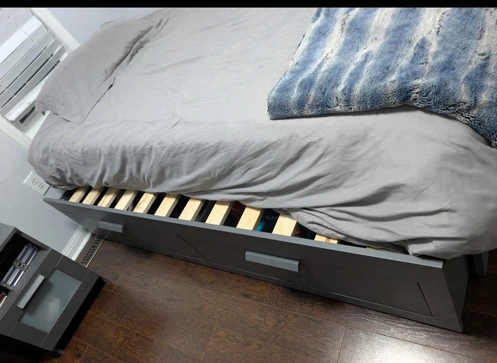 Selling an IKEA Brimnes daybed frame in grey and 2 IKEA foam mattresses! This bed frame is perfect for small spaces and doubles as a sofa during the day. The mattresses stack for single use, and then use side by side when expanding the bed. It has two spacious drawers underneath for extra storage, which is always a plus. The bed frame and mattresses are in great condition and ready for a new home! You will need a truck for pick up. We will have bed partly disassembled. Smoke and pet free home.
