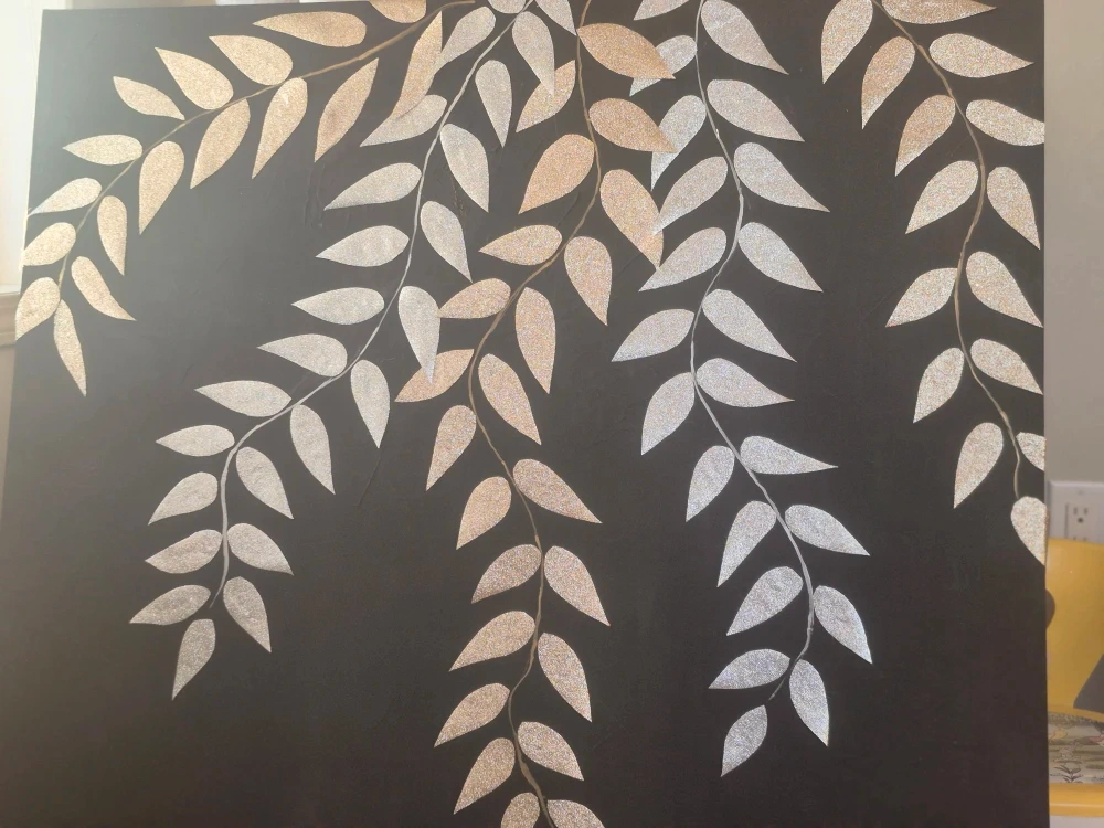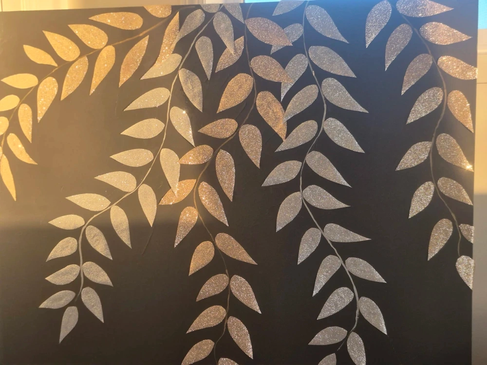 This is a handmade piece of wall art with a leaf design. The leaves are in gold and silver glitter against a dark background. It would look great in any room.Measurements 40"/40".