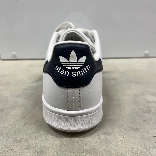 Step out in style with these Adidas Stan Smith sneakers. These classic white sneakers feature a navy accent on the heel and come in size 7. While these shoes are used, they're still in great shape and ready to add a touch of timeless cool to your wardrobe. There is minor scuffing on the toe.