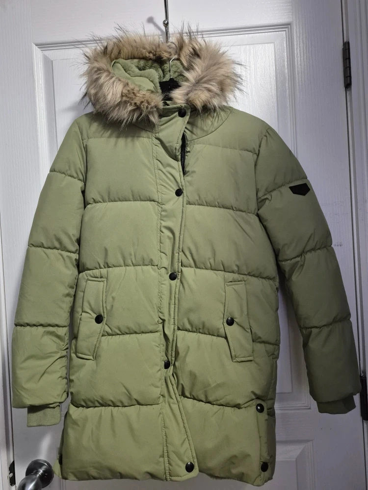 Selling a Sam Edelman Puffer jacket purchased at the Bay in a lovely sage green colour! It's super cozy and perfect for the colder months. The jacket features a faux fur trim on the hood, adding a touch of style and warmth. Only worn a couple of times.