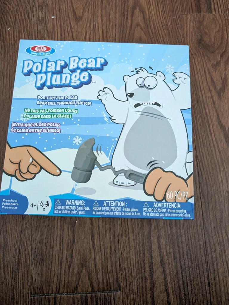 Selling a gently used Ideal Polar Bear Plunge game! It's a fun and engaging game for preschoolers and older kids (4+). The game includes 60 pieces. Don't let the polar bear fall through the ice!