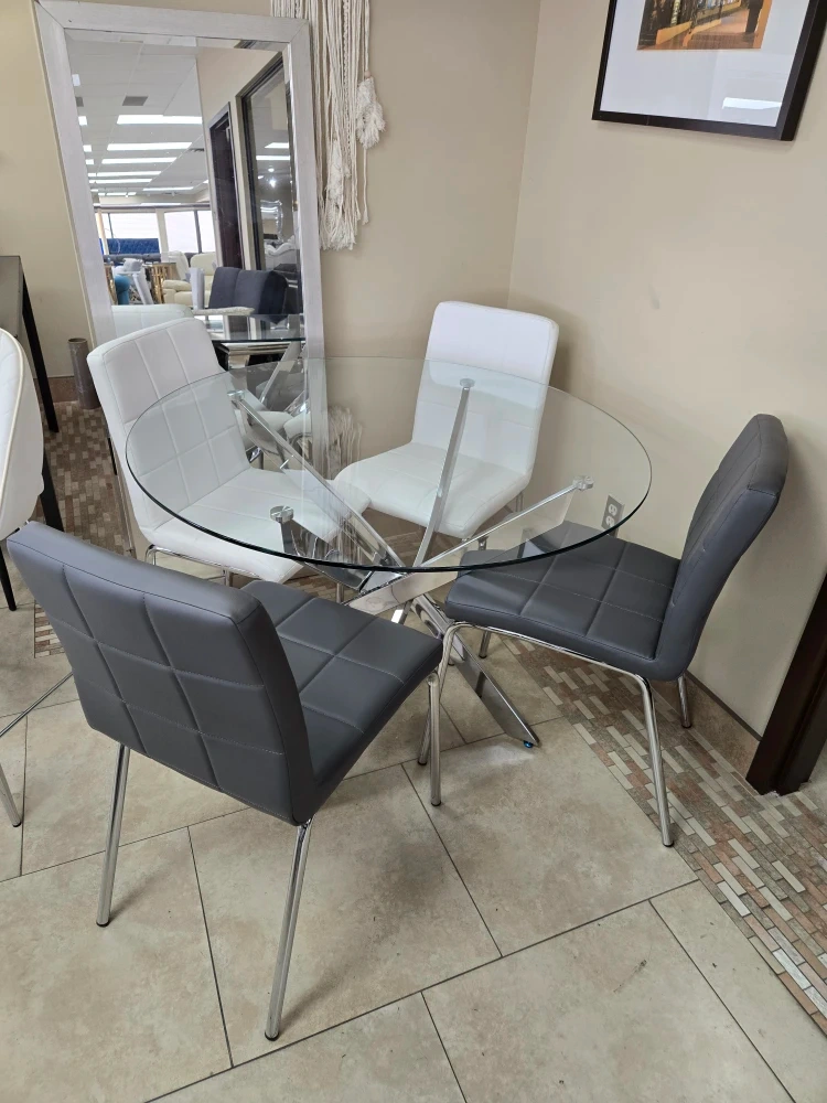 Selling a stylish round glass dining table that comes with four chairs, adding a modern touch to any dining space. The chairs have a sleek design with chrome legs, and the table features.
