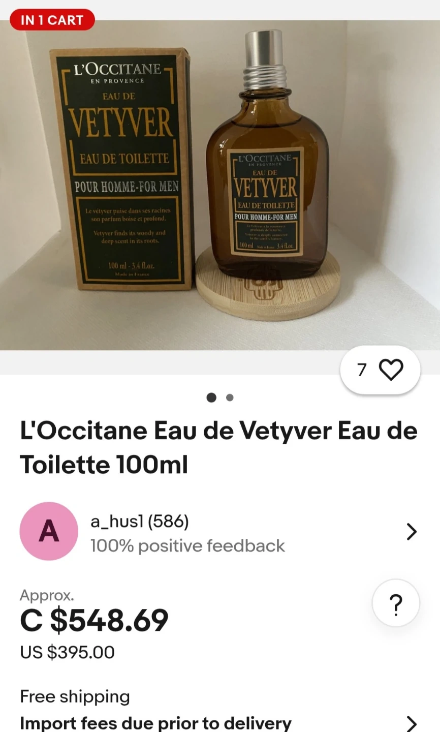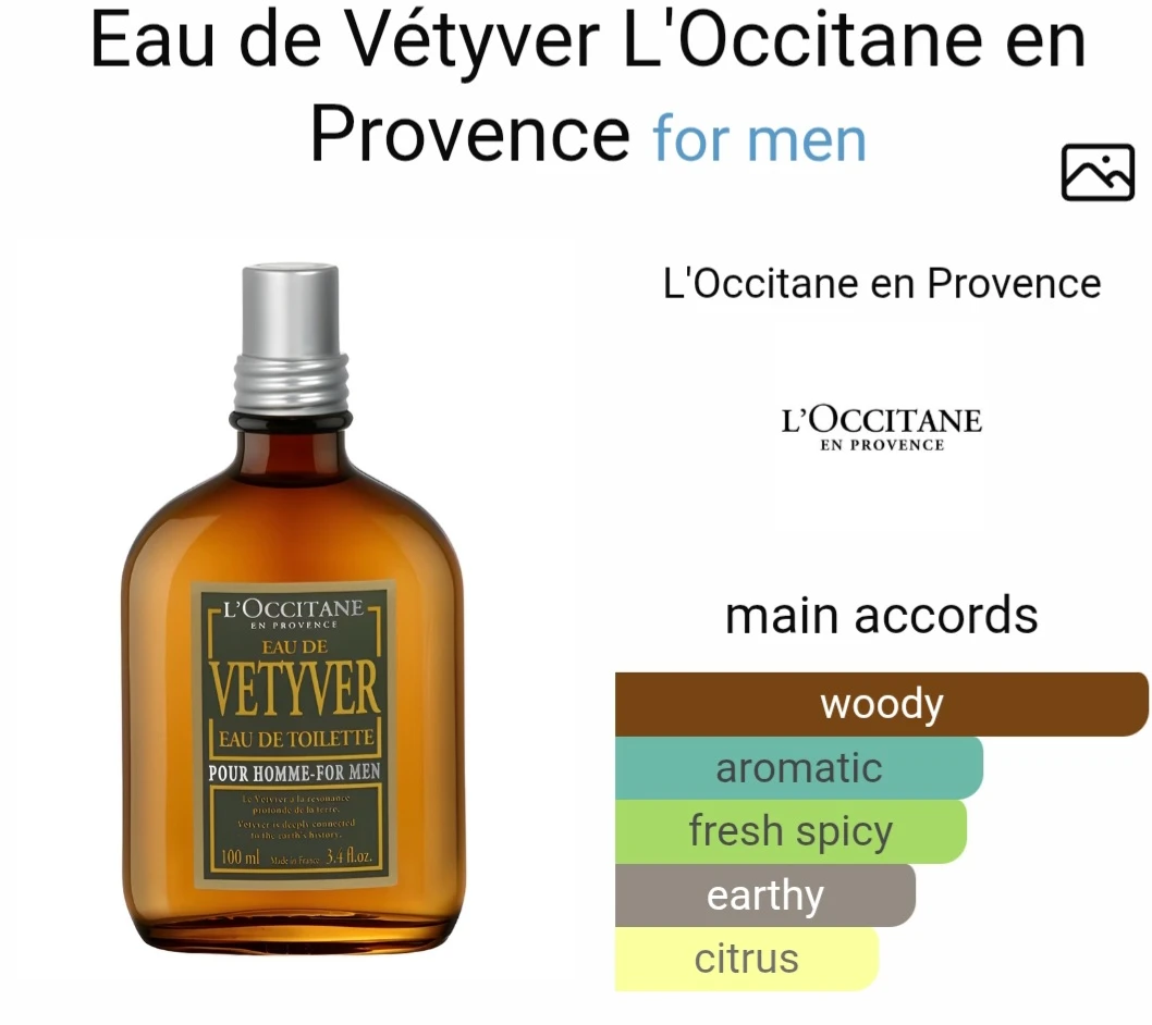 Selling a bottle of L'Occitane Vetyver Eau de Toilette for men. It's a 100ml bottle with a woody and deep scent, made in France.