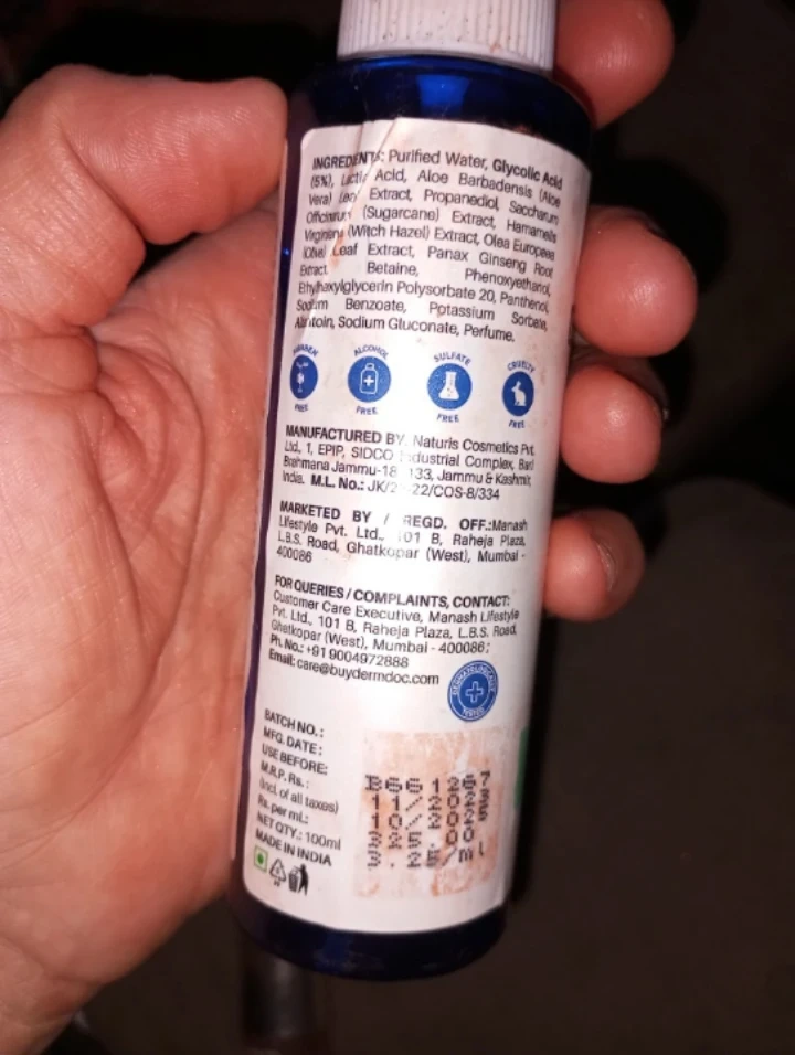 Ingredients include purified water, glycolic acid (5%), lactic acid, aloe barbadensis (aloe vera) leaf extract, propanediol, saccharum officinarum (sugarcane) extract, hamamelis virginiana (witch hazel) extract, olea europaea (olive) leaf extract, panax ginseng root extract, betaine, phenoxyethanol, ethylhexylglycerin polysorbate 20, panthenol, sodium benzoate, potassium sorbate, allantoin, sodium gluconate, and perfume.