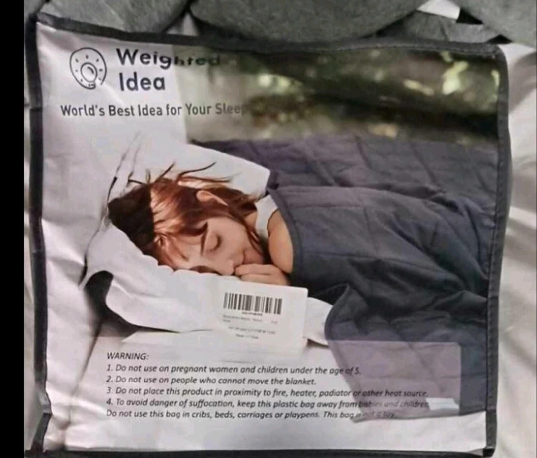 Selling a Weighted weighted blanket in grey! It's brand new and still in its original packaging. The blanket measures 122cm x 198cm and weighs 15lbs. Perfect for a cozy night's sleep!