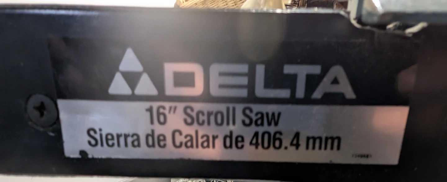 Delta 16"scroll saw. Has a tilting table for bevel cuts, often tilting to the left. cast iron base for stability.