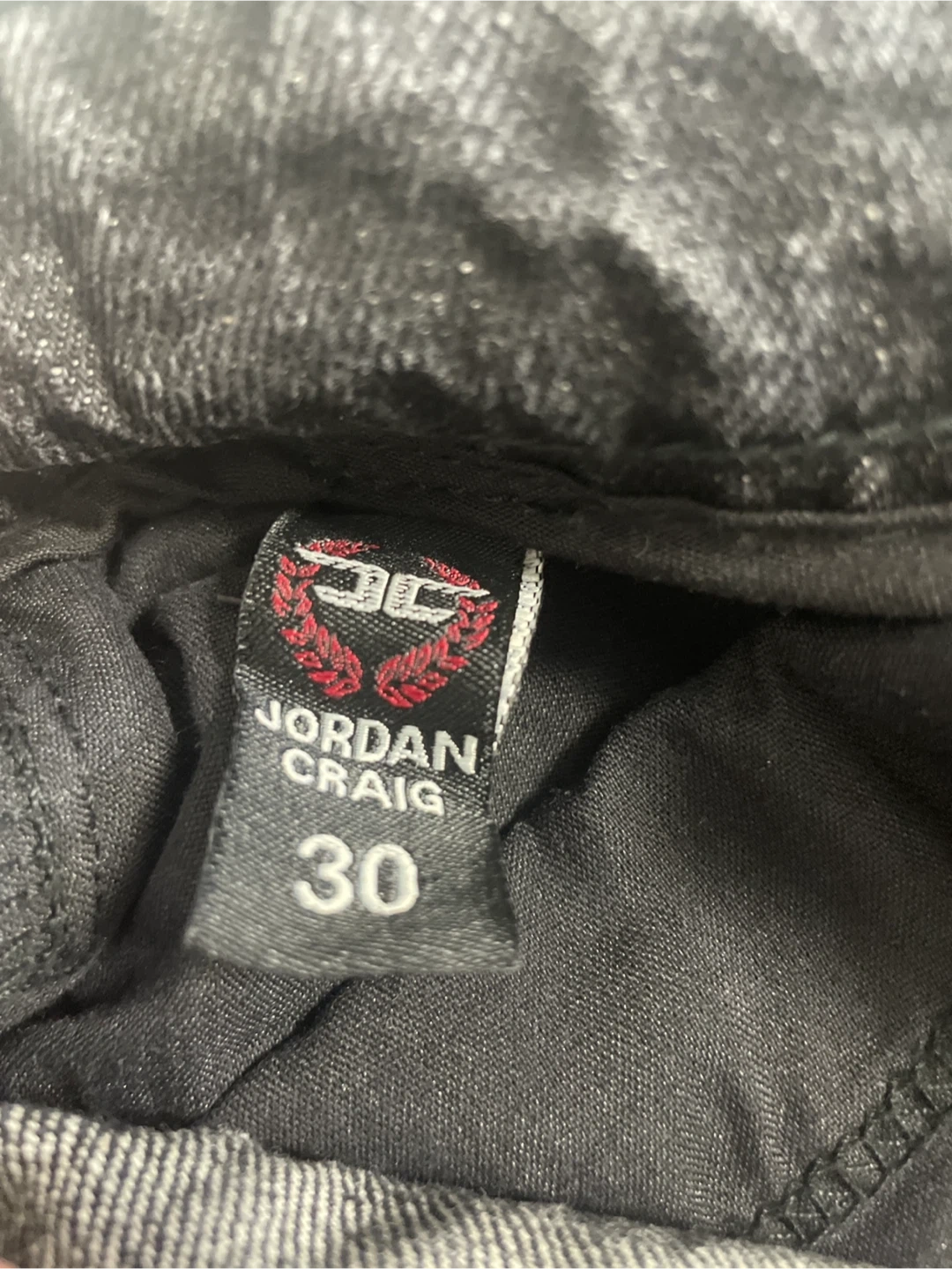 Selling a pair of Jordan Craig distressed denim shorts in size 30. They have a unique, edgy look with the distressed detailing and frayed hem. Perfect for casual wear!