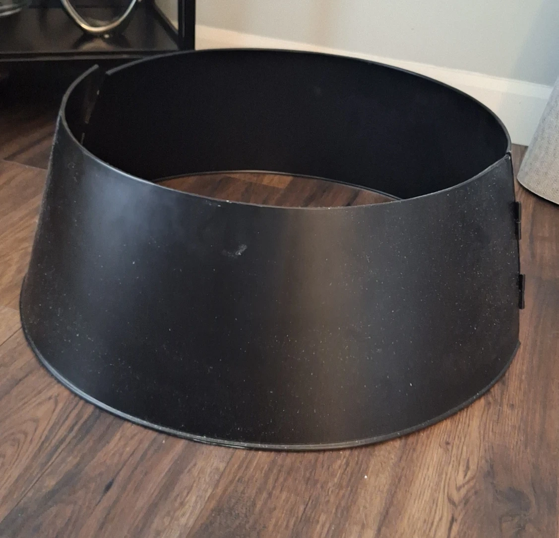 Here's a simple black metal Christmas tree collar. It's in good condition and ready to add a modern touch to your holiday decor!