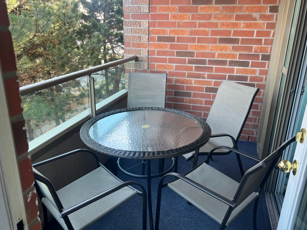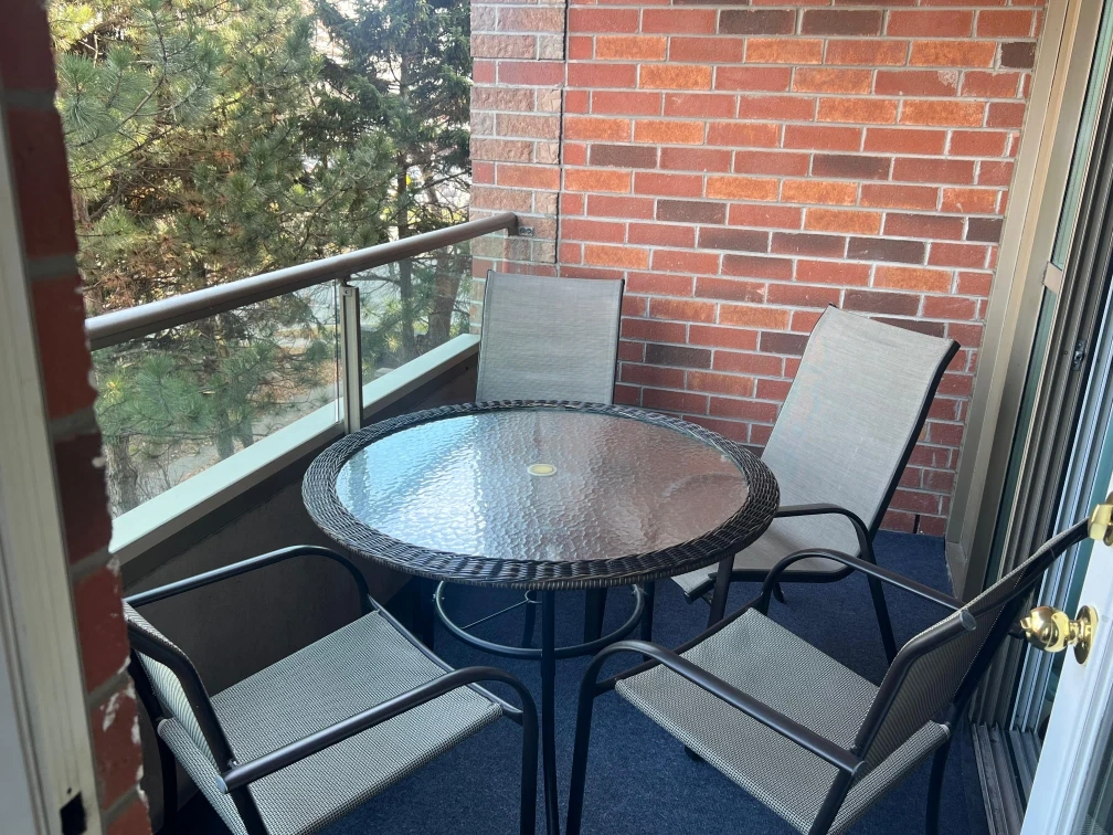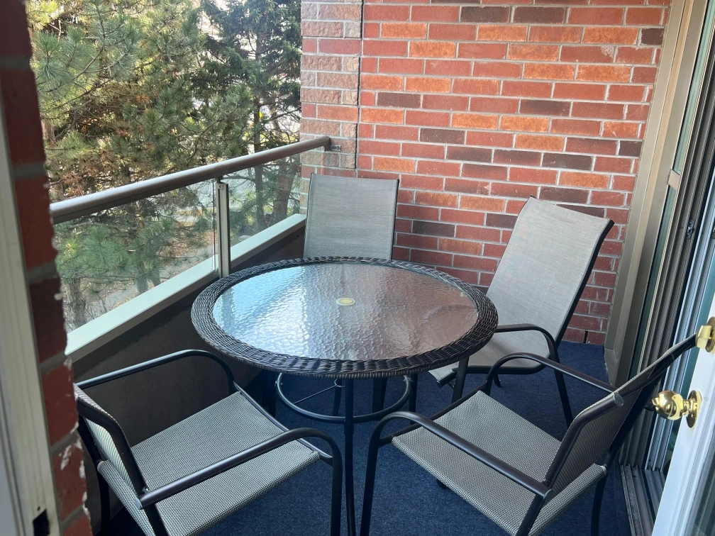 Selling a patio set that includes a round table and four chairs. It's perfect for a balcony or patio space. The table has a glass top with a woven edge, and the chairs are a neutral colour. It's in great condition and ready for your outdoor enjoyment