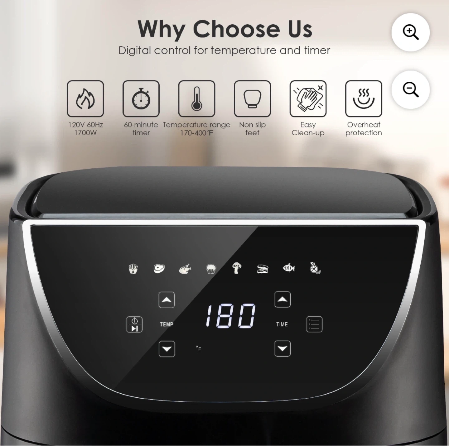 One-touch presets for fries, chicken, steak, fish, veggies, and more—no guesswork, just perfect results.