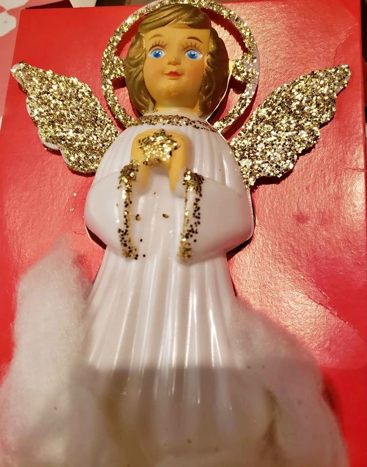 2 vintage Doubl Glo angel Christmas tree toppers. One is older than the other one. Slightly different paint tones for the skin and eyes. Both golden haired with glittery wings and halo and filmy cotton clouds on the bottom of the dresses. Made of hard vintage plastic. Lightweight for the top of the tree. Both come with boxes. $50 for both.