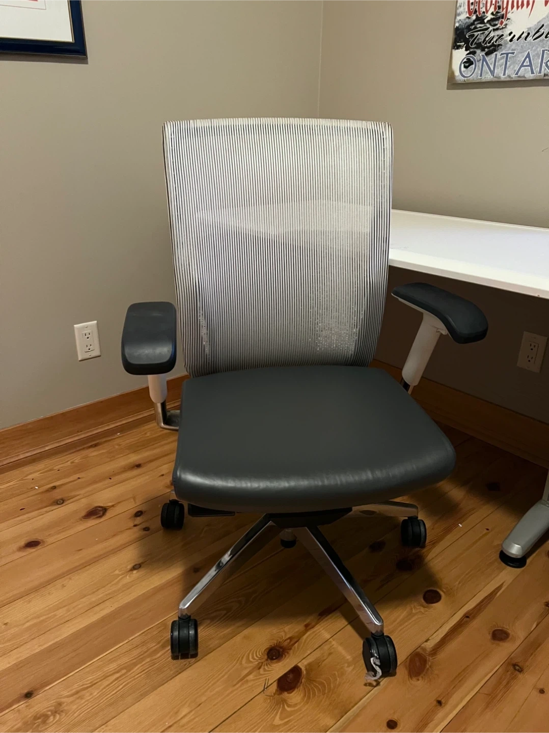 (2). Global office chair (G20), white mesh back and charcoal gray mock-leather seat.
