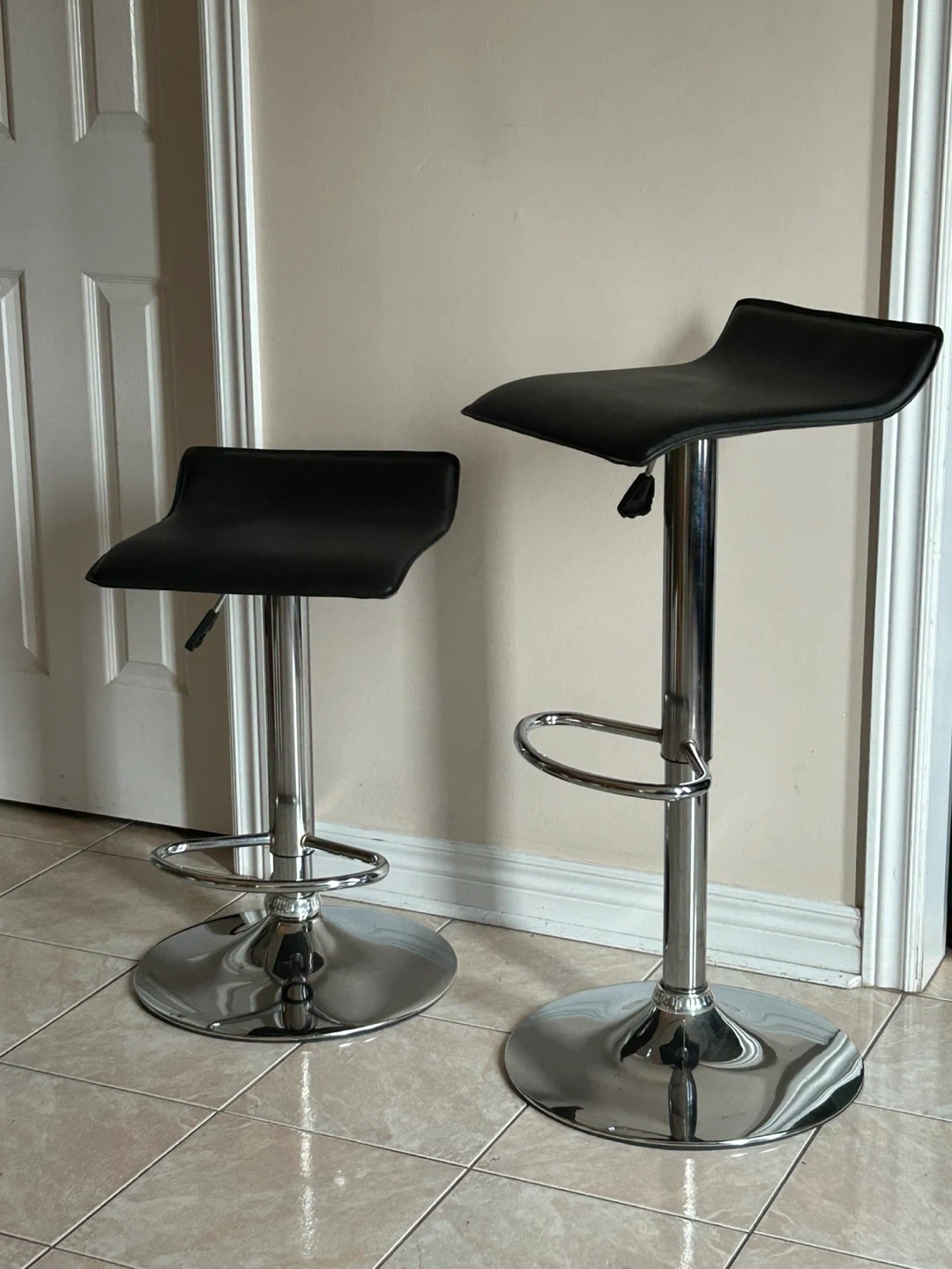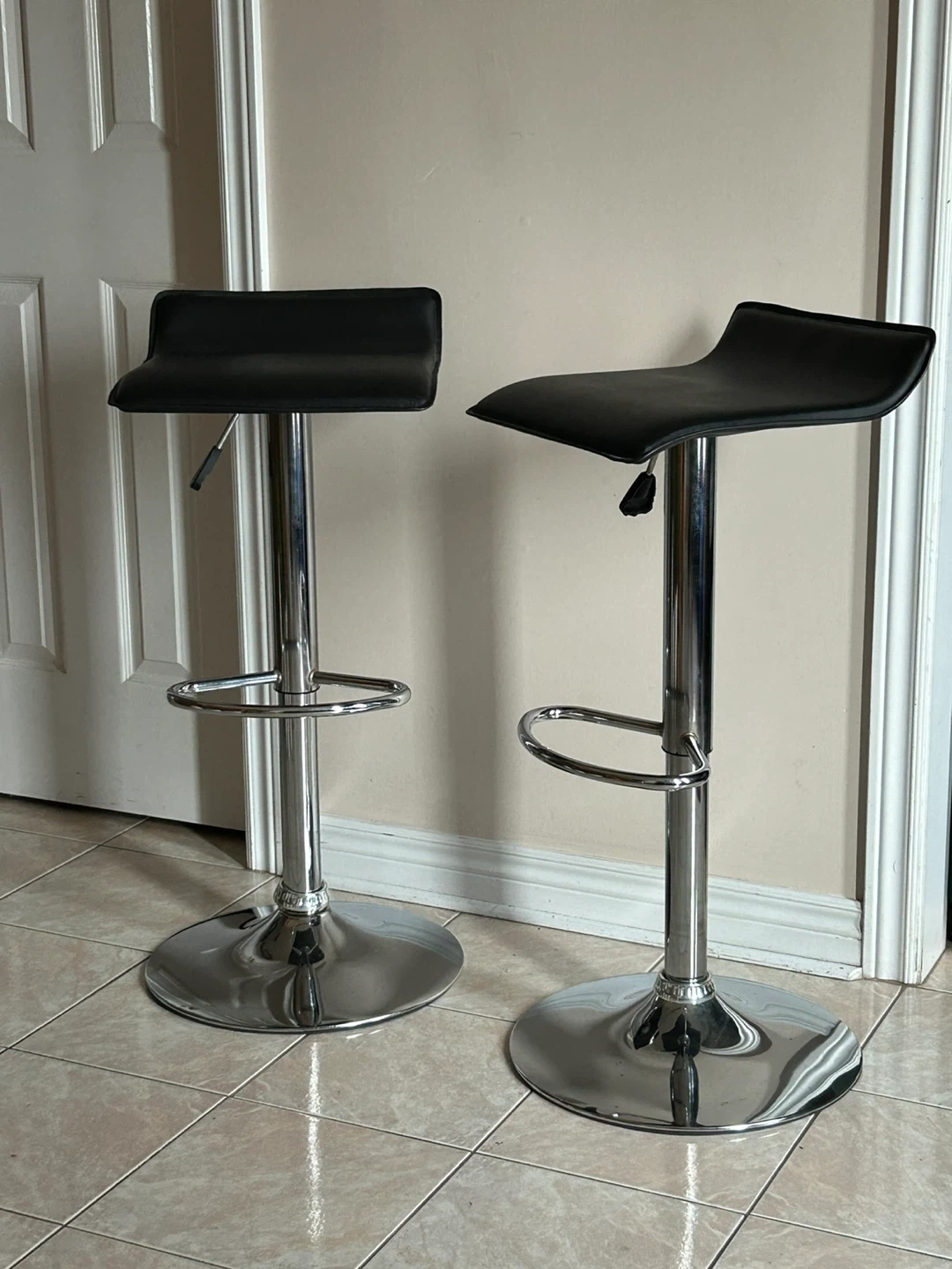 Selling a set of two bar stools. They feature a sleek, modern design with chrome bases and black seats. Perfect for adding a touch of style to your kitchen or bar area