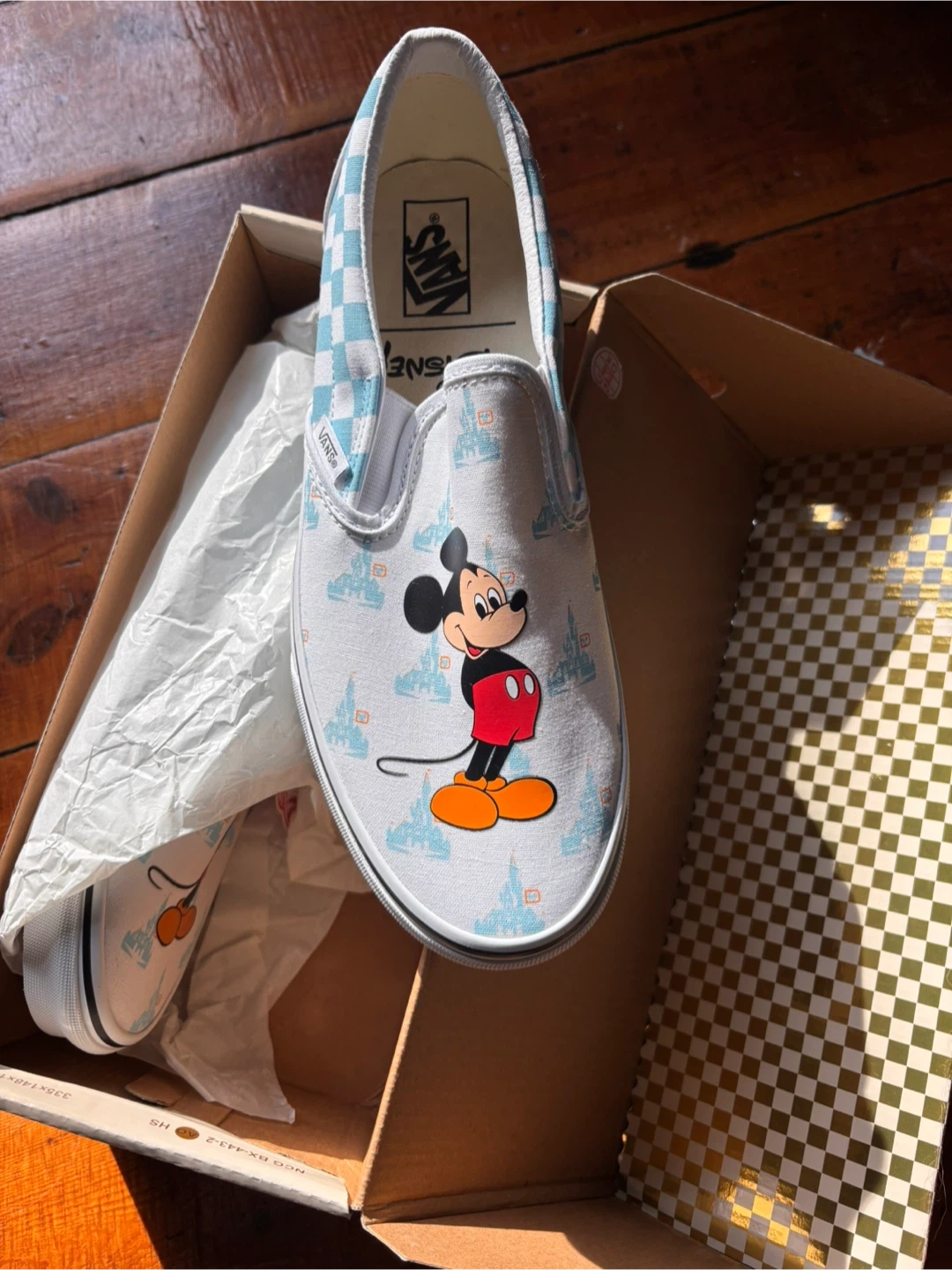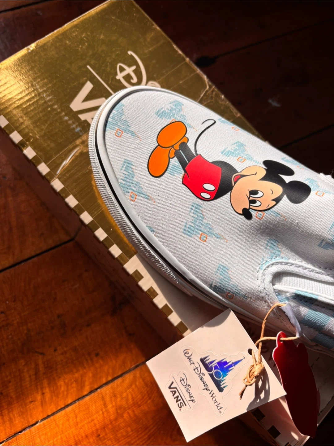 Selling a pair of brand new Vans Classic Slip-Ons in the Disney Mickey Mouse Blue design! These are a US men's size 10. They feature a fun Mickey Mouse and castle print on a white background with a light blue checkered pattern on the sides. Comes with the original box although box is a bit damaged as it was used for the shipping label. They are special edition 50 years of Walt Disney world.