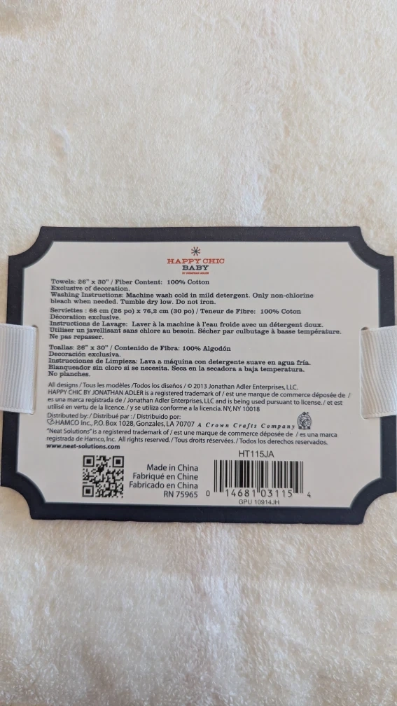 This Happy Chic Baby hooded towel is brand new and ready for a new home! The towel is 26" x 30" and made of 100% cotton. It's machine washable with mild detergent, and you can tumble dry it on low. Super cute for bath time.