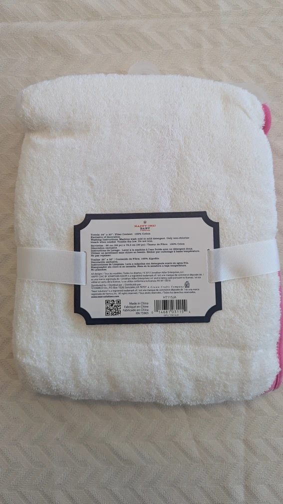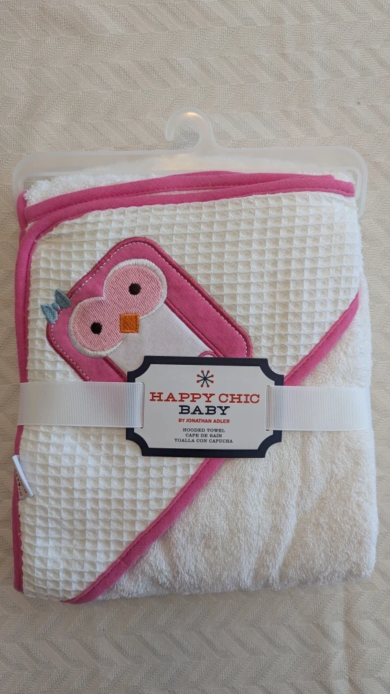 This Happy Chic Baby hooded towel is brand new and ready for a new home! The towel is 26" x 30" and made of 100% cotton. It's machine washable with mild detergent, and you can tumble dry it on low. Super cute for bath time.