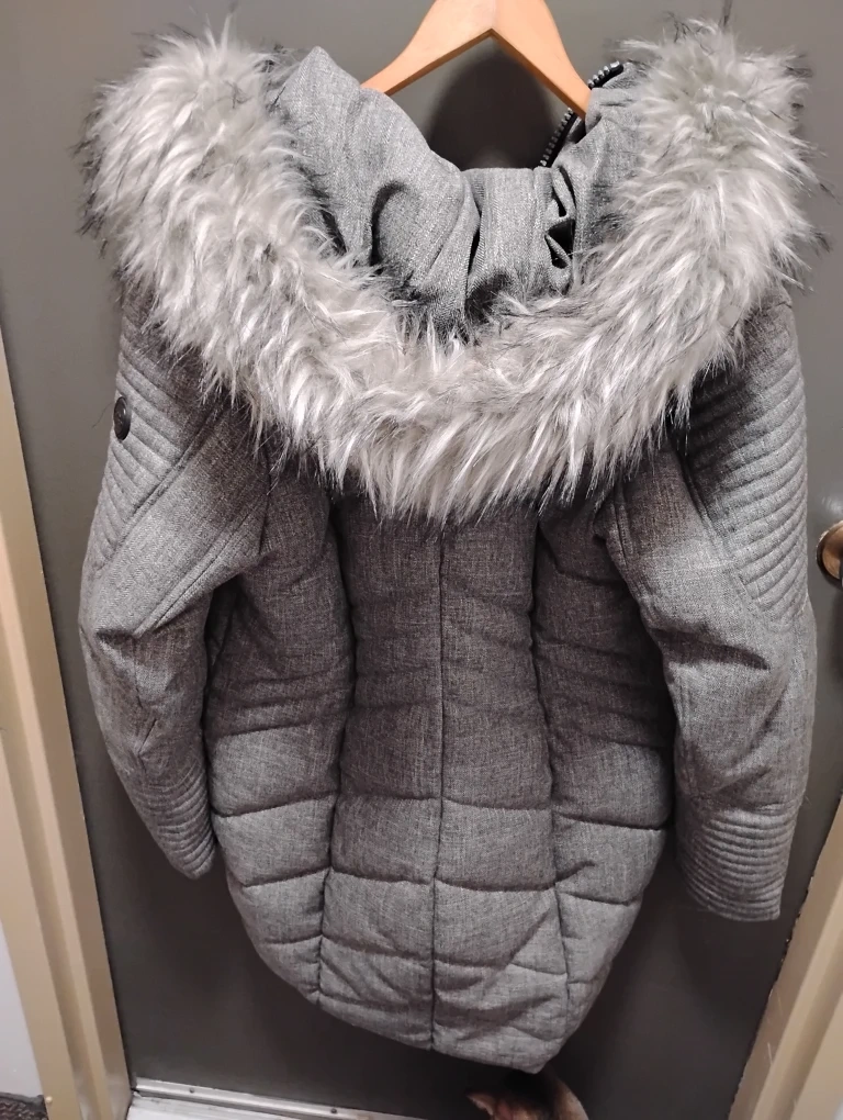 Here's a Point Zero winter coat in a lovely grey colour! It's perfect for staying warm during the colder months. The coat has a stylish design and is in great condition. Feel free to message me if you have any questions!