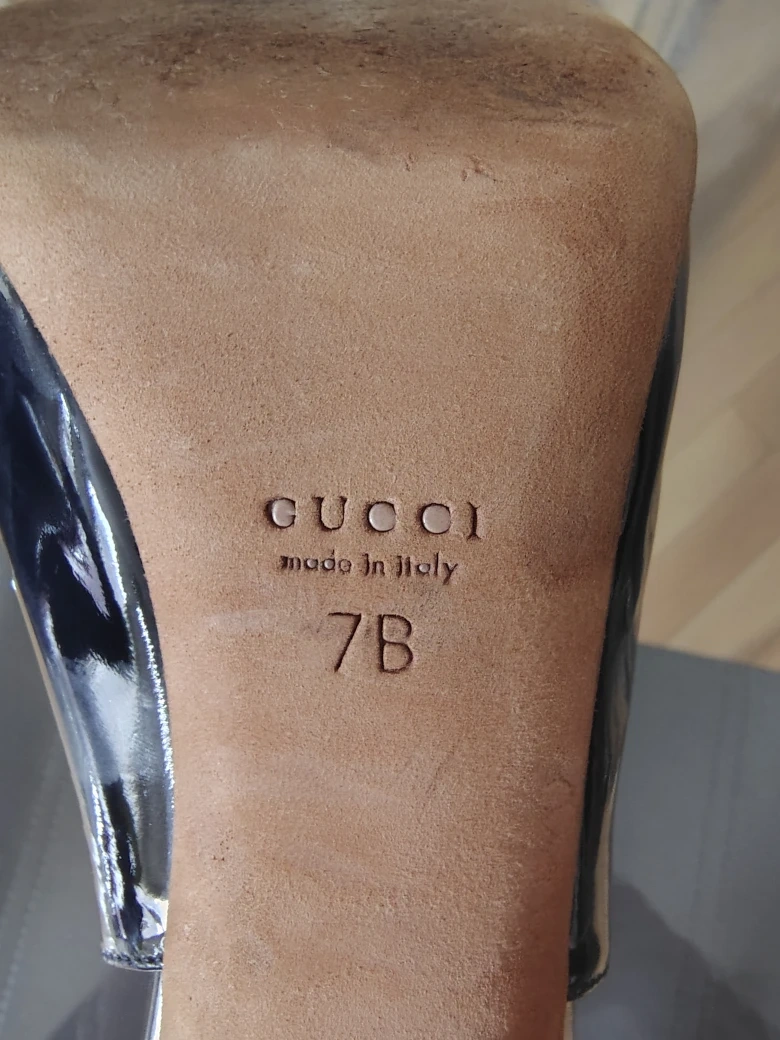 Beautiful pair of Authentic Gucci slingback heels in a rich navy patent leather. Classic peep-toe style with a sleek, elegant look. Details: • Size 7B • Navy patent leather • Peep-toe slingback • Gently used and in excellent condition • Originally purchased at Miss You on Ossington (designer resale boutique) These are timeless, high-quality heels with lots of life left in them. Price: $220 Firm Pickup in downtown Toronto, King West