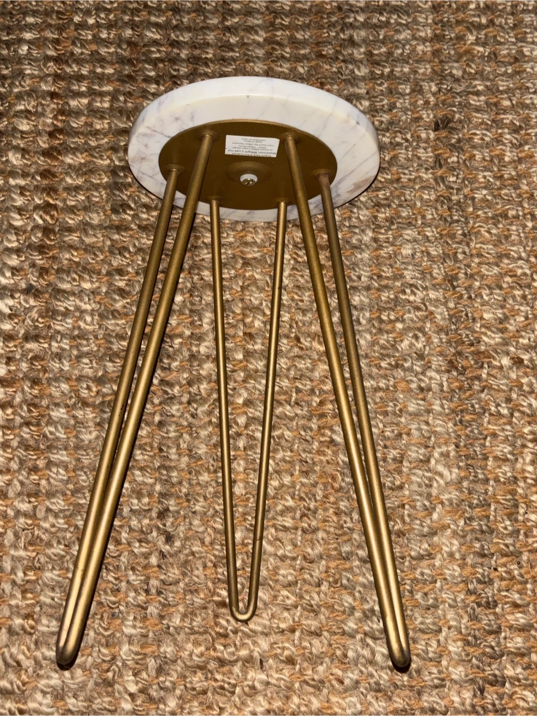 Selling a stylish accent table with a marble top and gold-colored metal 3 legs. The top is approximately 8 inches in diameter. It's sturdy and perfect for adding a touch of elegance to any room!