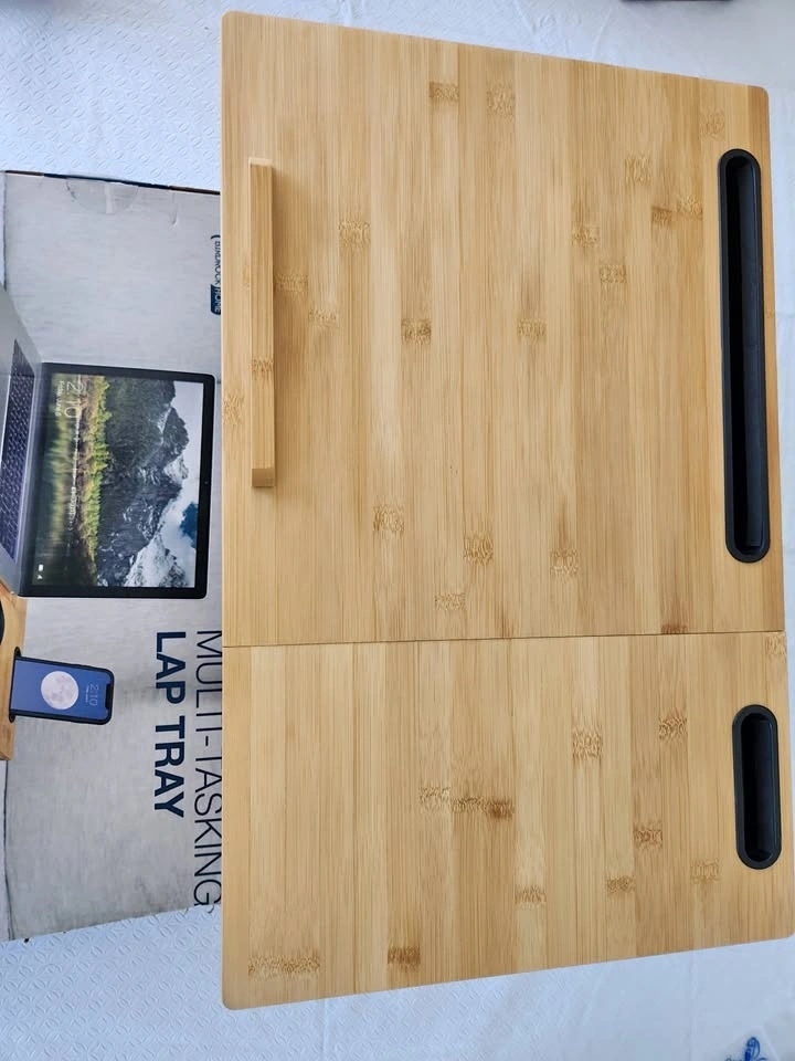 Barely used lap tray. Specs are on the front of the box in the photo. I paid $75 for it. It was never used, but the box has some damage.