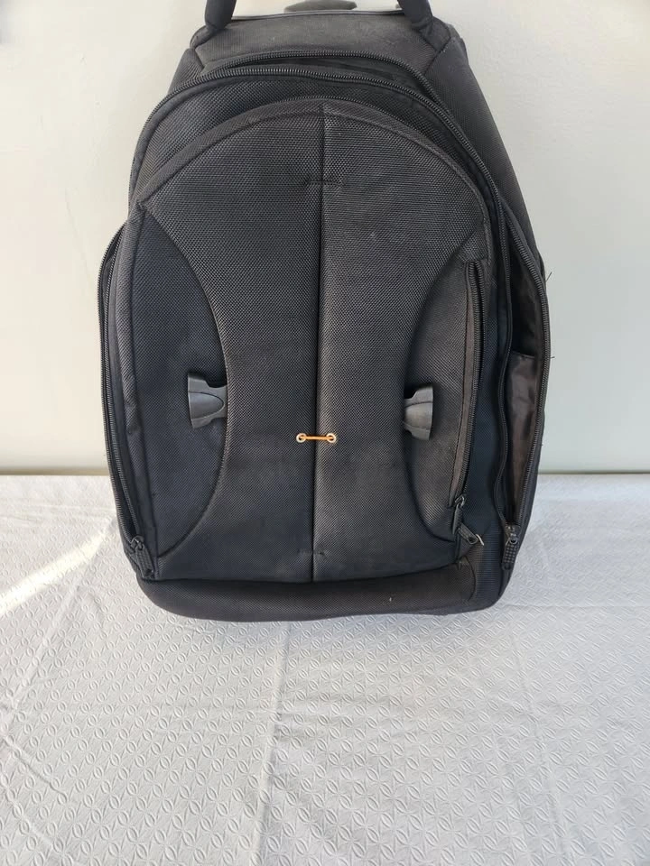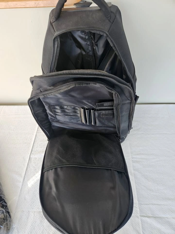 Has lots of pockets, inside, front and sides, including padded one for laptops.