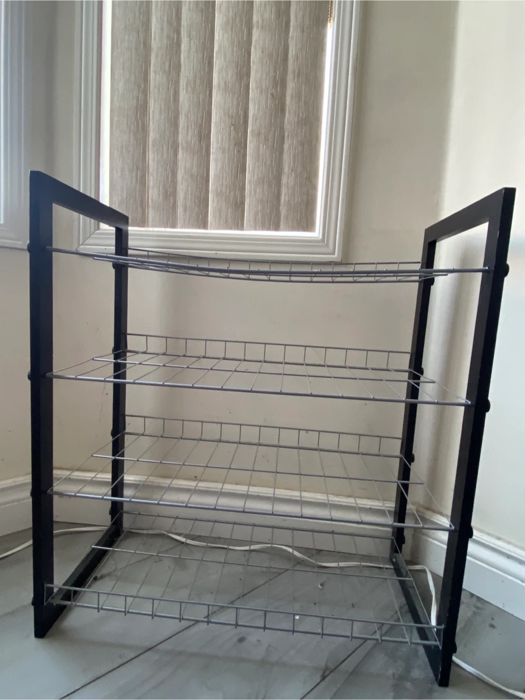 Selling a shoe rack with a black metal frame and wire shelves. It's in great shape and ready to organize your footwear!