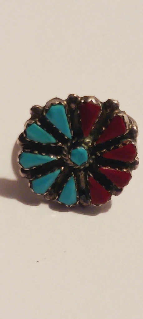 ZUNI NATIVE AMERICAN TURQUOISE RED CORAL PETIT POINT FLOWER DESIGN STERLING SILVER 925 SIGNED RING. SIZE