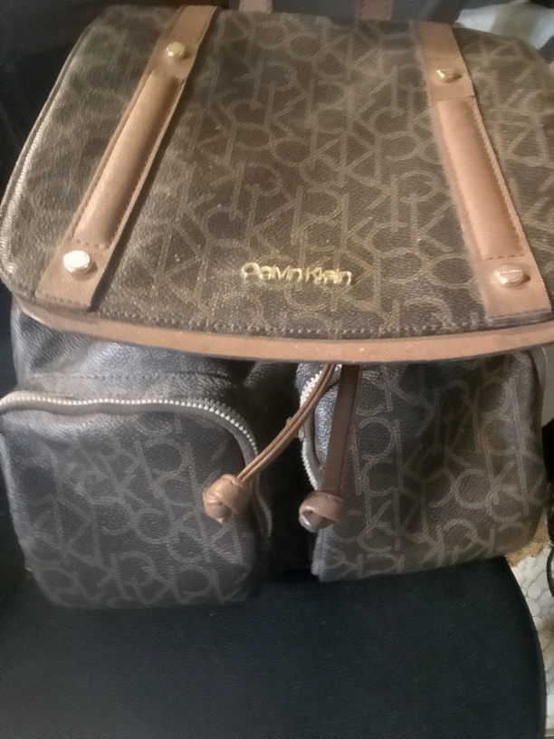 Here's a Calvin Klein backpack in a stylish brown colour! It's got a unique pattern and some nice detailing. It's perfect for carrying your essentials around town.
