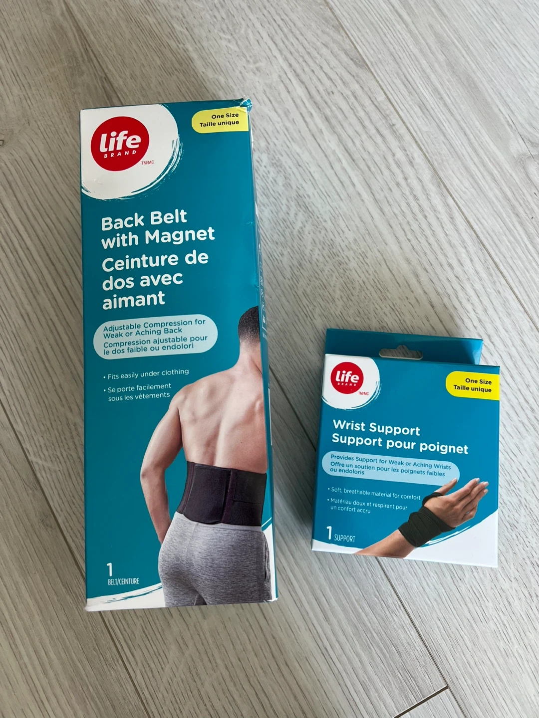 This set includes a Life Brand magnetic back belt and a wrist support. Both are one size and designed for adjustable compression and support. The back belt fits easily under clothing, and the wrist support is made of soft, breathable material for comfort.