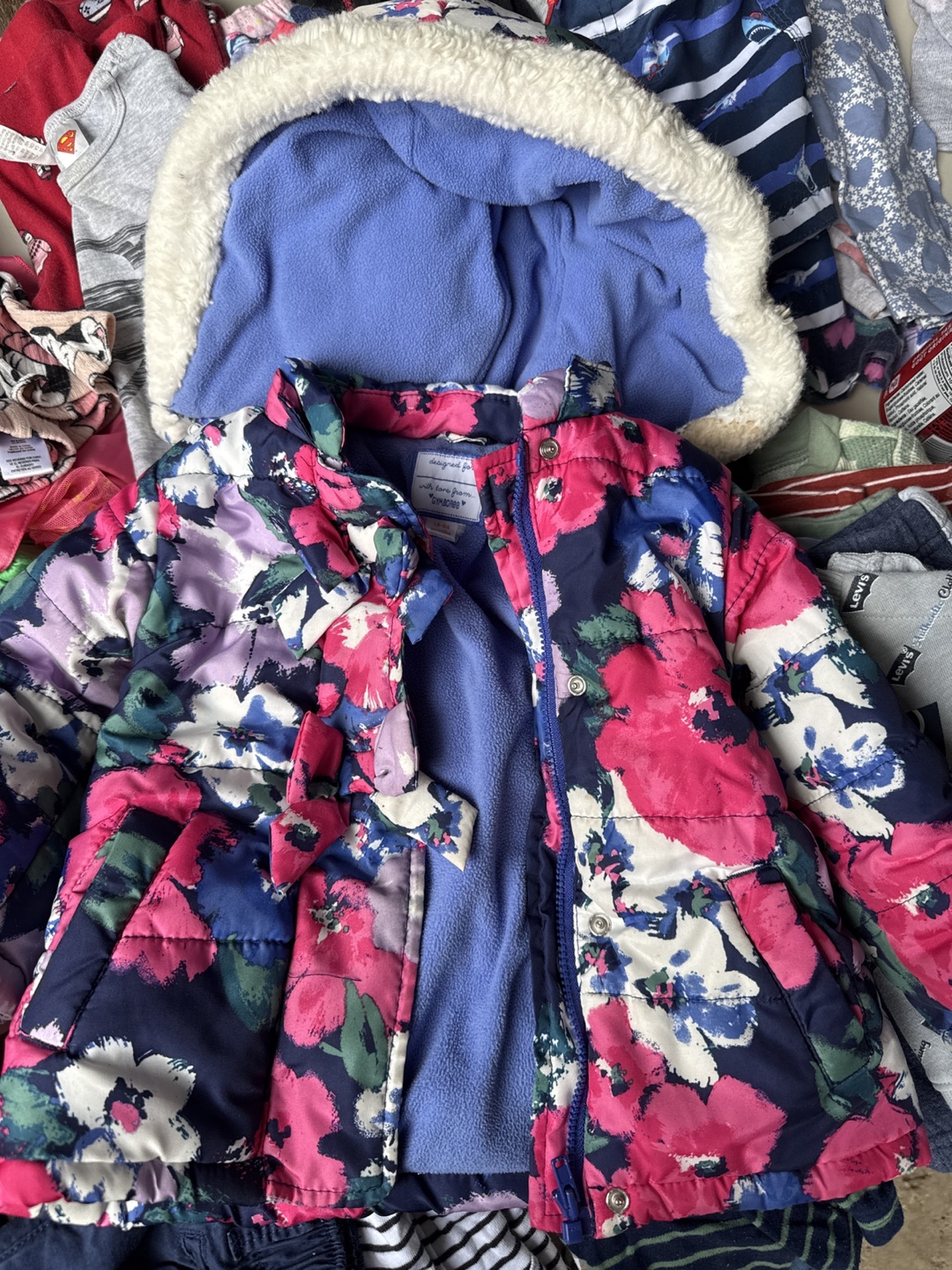 A super cute and cozy winter jacket from OshKosh B'gosh! This jacket features a beautiful floral pattern with pink, blue, and white flowers on a navy background. The inside is lined with soft, light blue fleece, and the hood has a fluffy white faux fur trim. Perfect for keeping your little one warm and stylish during the colder months!