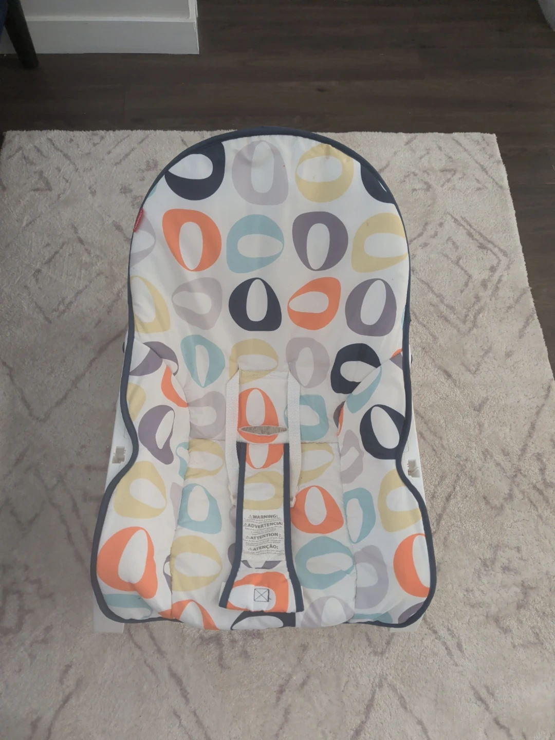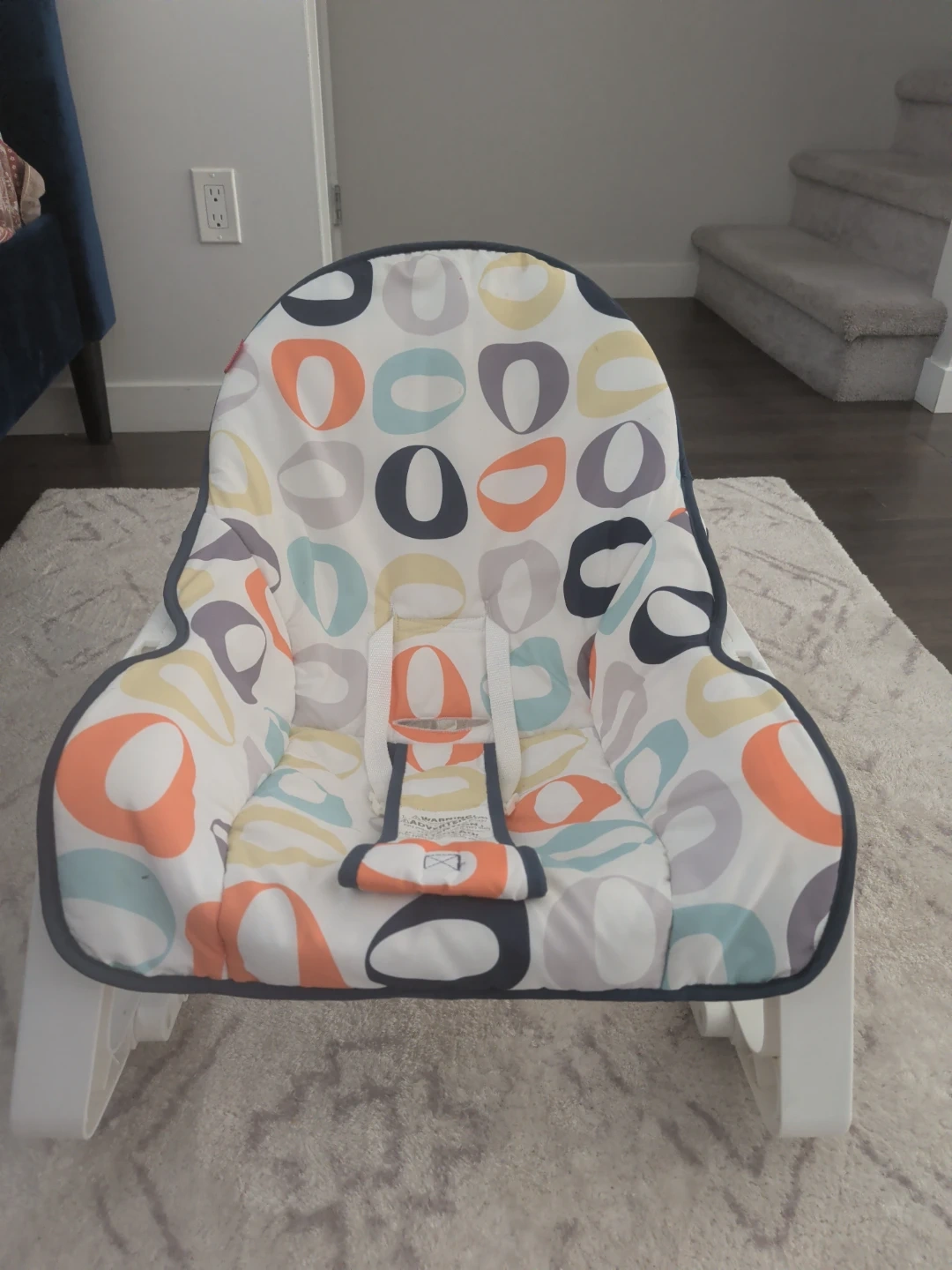 Fisher-Price baby rocker with a fun, colourful pattern. It's got a secure harness and a comfortable seat for little ones. The gentle rocking motion can help soothe babies.