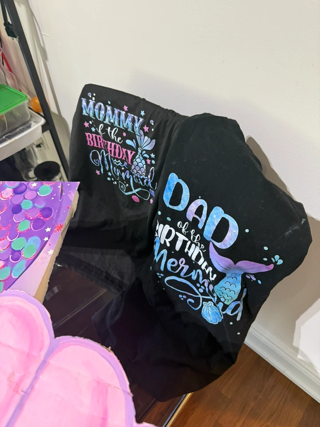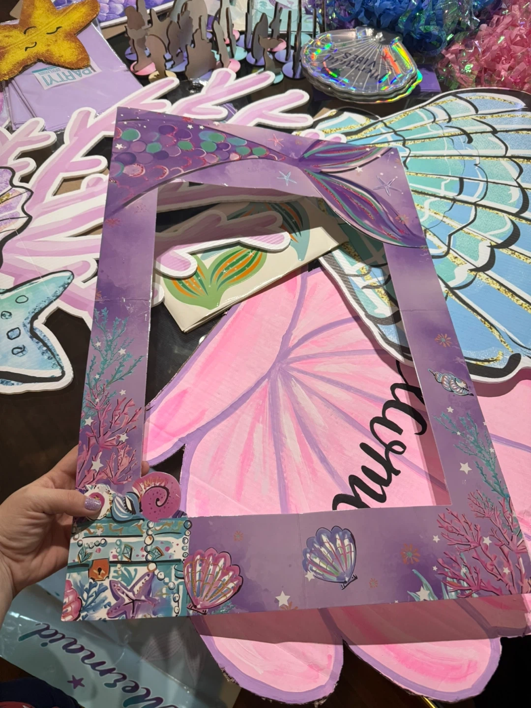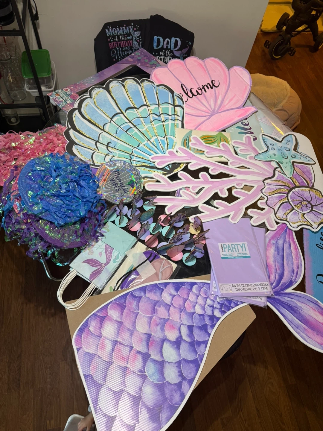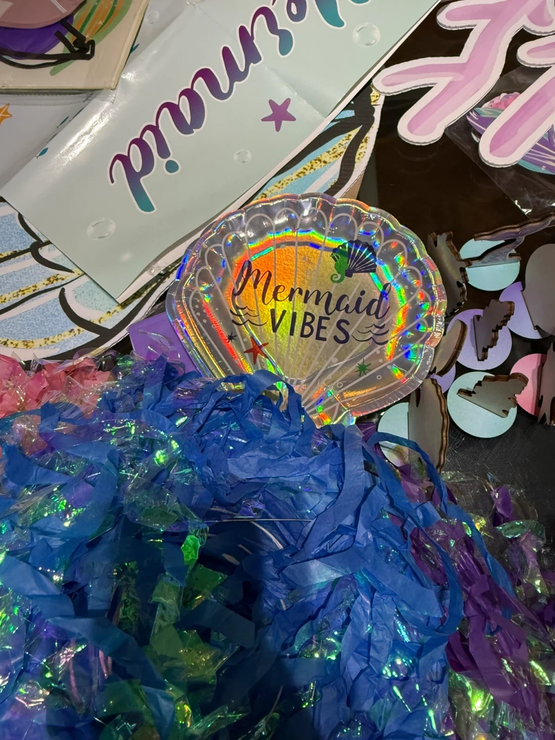 There is a diversity of items used once and some new items. Includes: decorations to put on the floor, on the table and on the wall. 6 jelly fish to be hanged, gift bags, plates, 2x game to put the mermaid tail, holder for pictures, 2x new purple table cloth, mom and dad t-shirt.