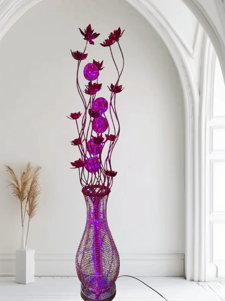 This beautiful floor lamp features a unique floral vase design in red and purple tones. It would make a stunning addition to any room!