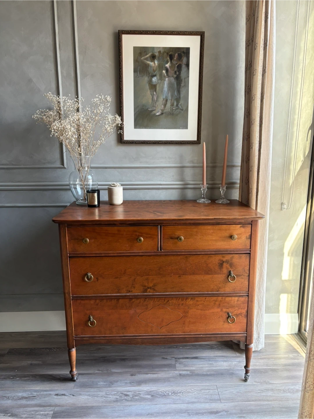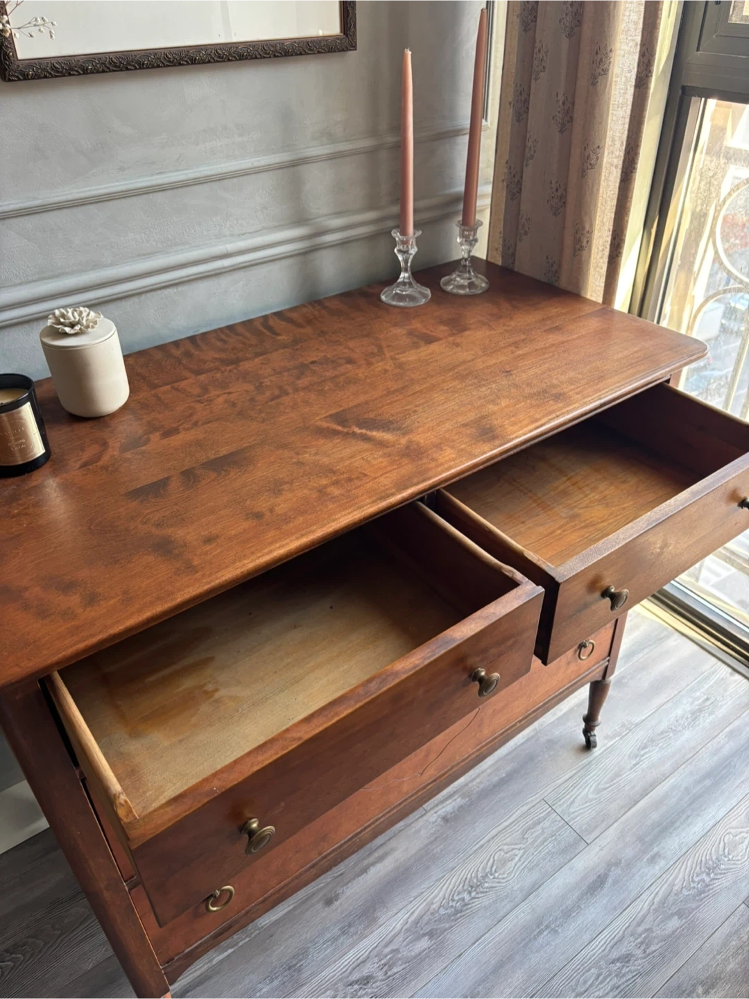 A lovely vintage wooden dresser with a warm, classic feel. Perfect for adding character to any room! It features multiple drawers for ample storage space.