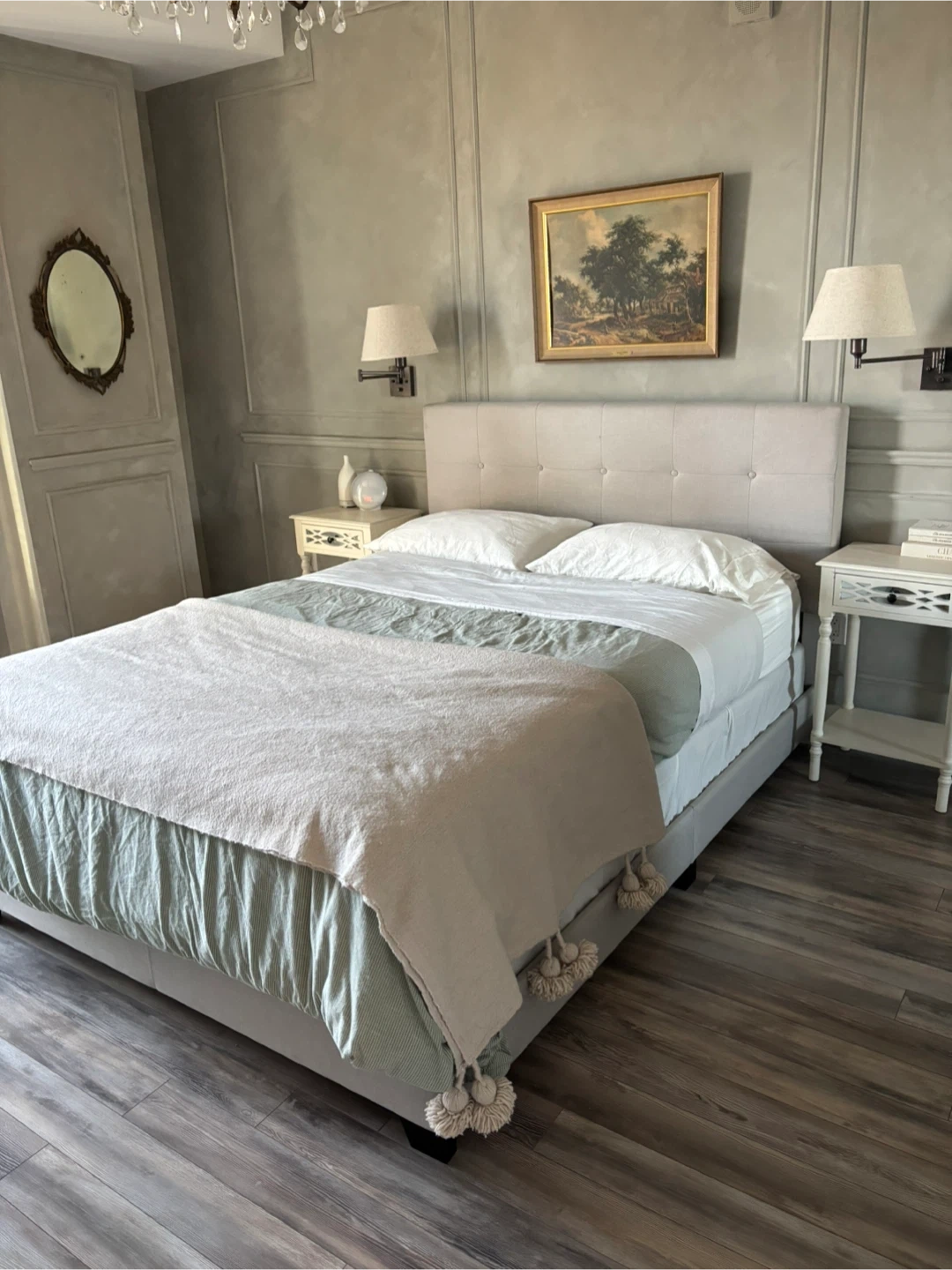 Queen Upholstered Bed Frame, Box Frame, and Mattress