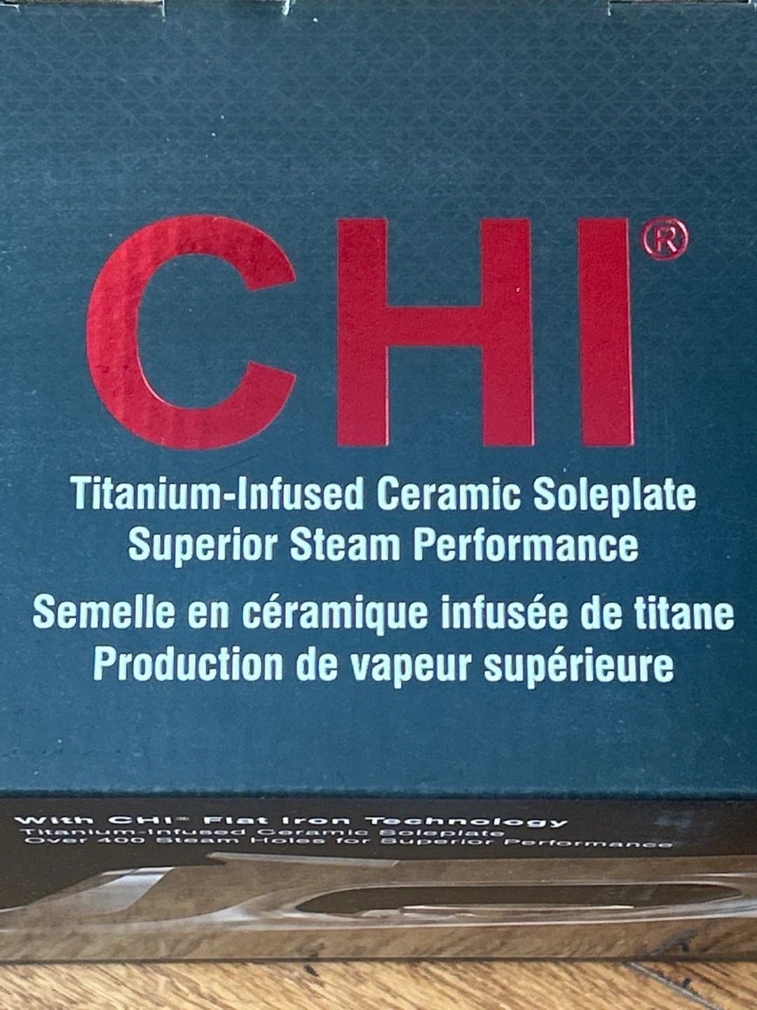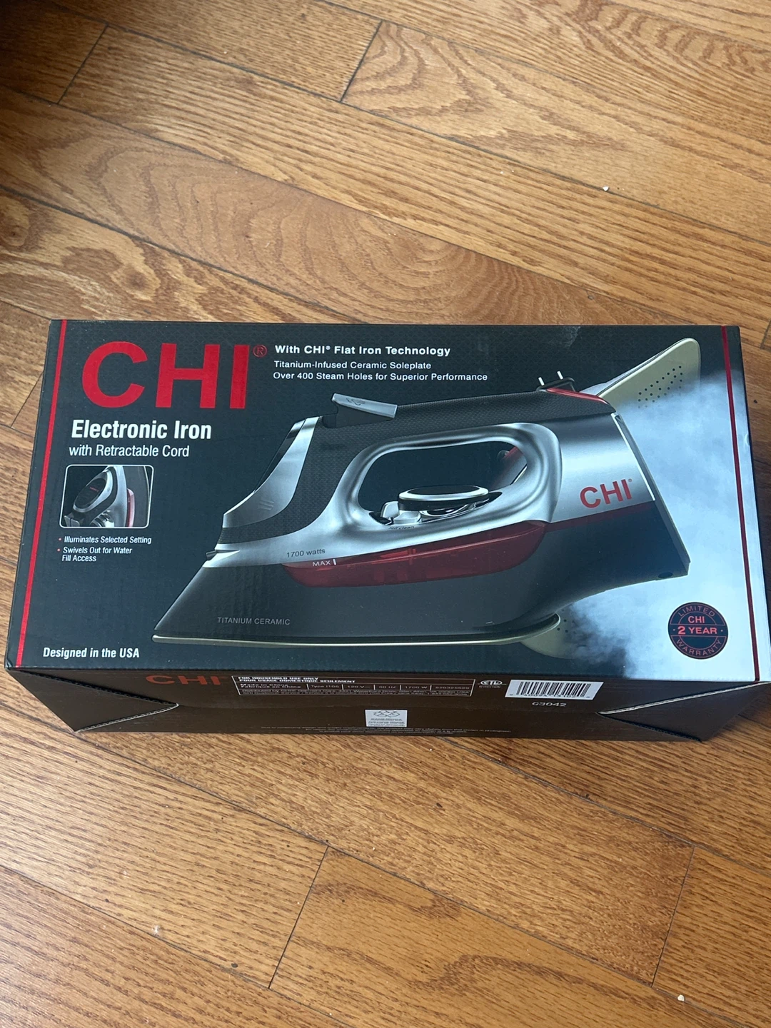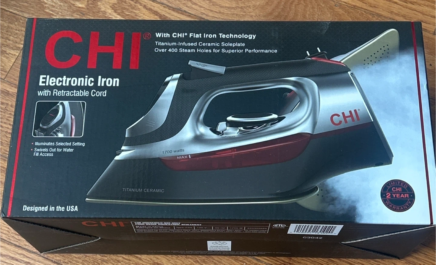 Selling a CHI electronic iron with a retractable cord. It features a titanium-infused ceramic soleplate and offers superior steam performance. The iron has electronic temperature control, precise temperature adjustment, and unique adjustable steam control. It also has an 8' retractable cord for easy storage