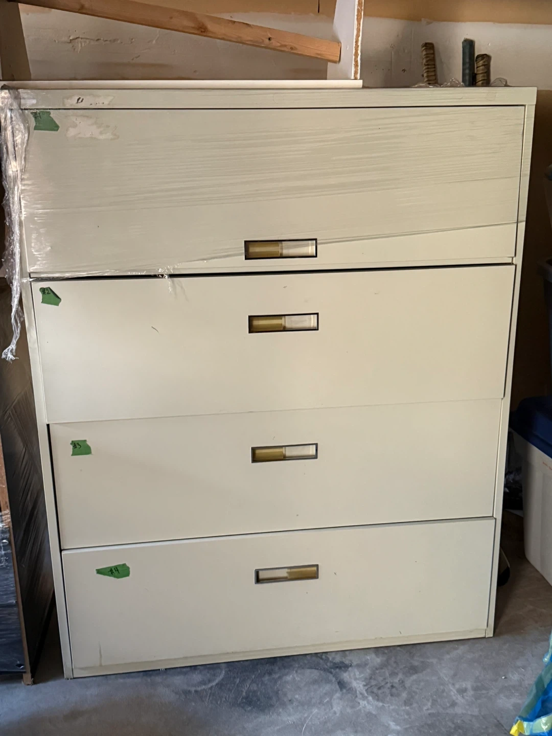 Selling a four-drawer filing cabinet! It's a great storage solution for your home office or workspace. The cabinet has a neutral colour and is in good condition, ready to help you organize your documents and files