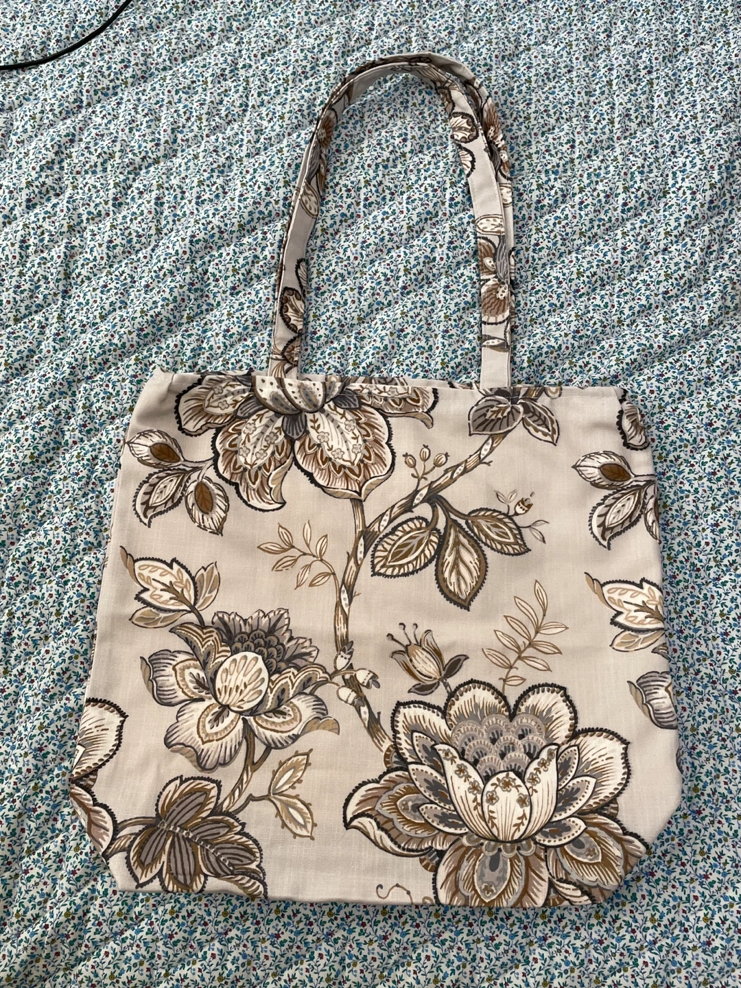 Selling a cute floral tote bag! It's in great condition and perfect for carrying your everyday essentials. The bag features a beautiful floral pattern in neutral tones. It's a stylish and practical accessory for shopping, work, or school