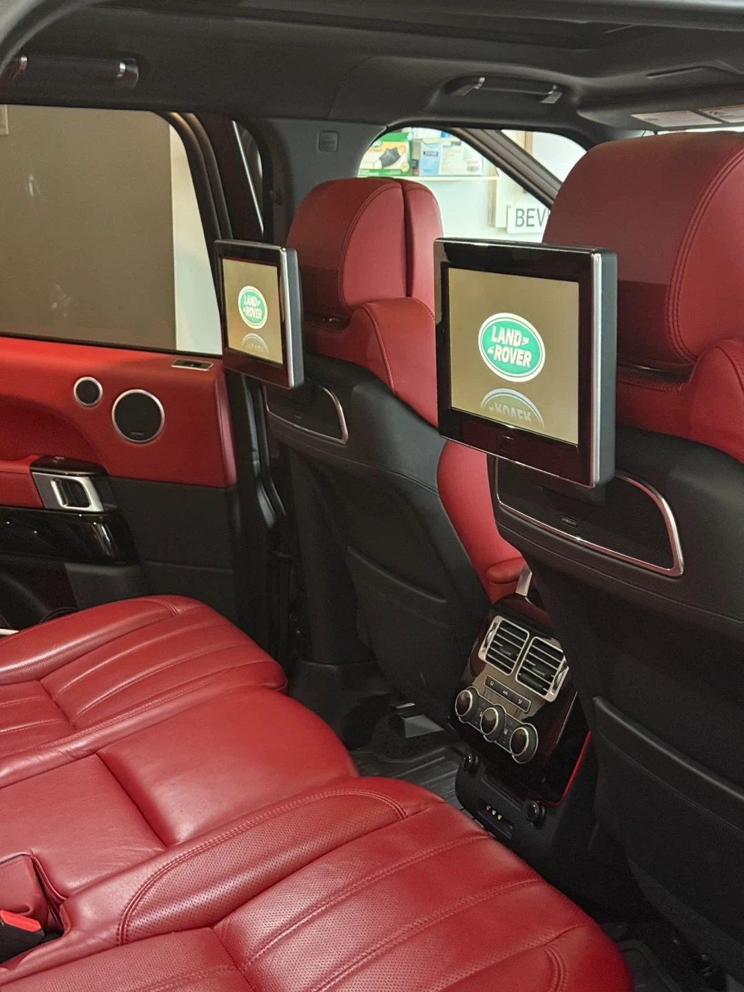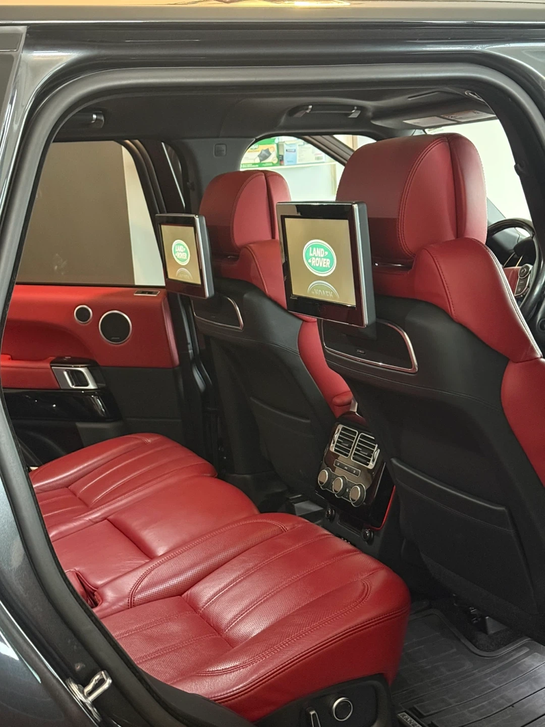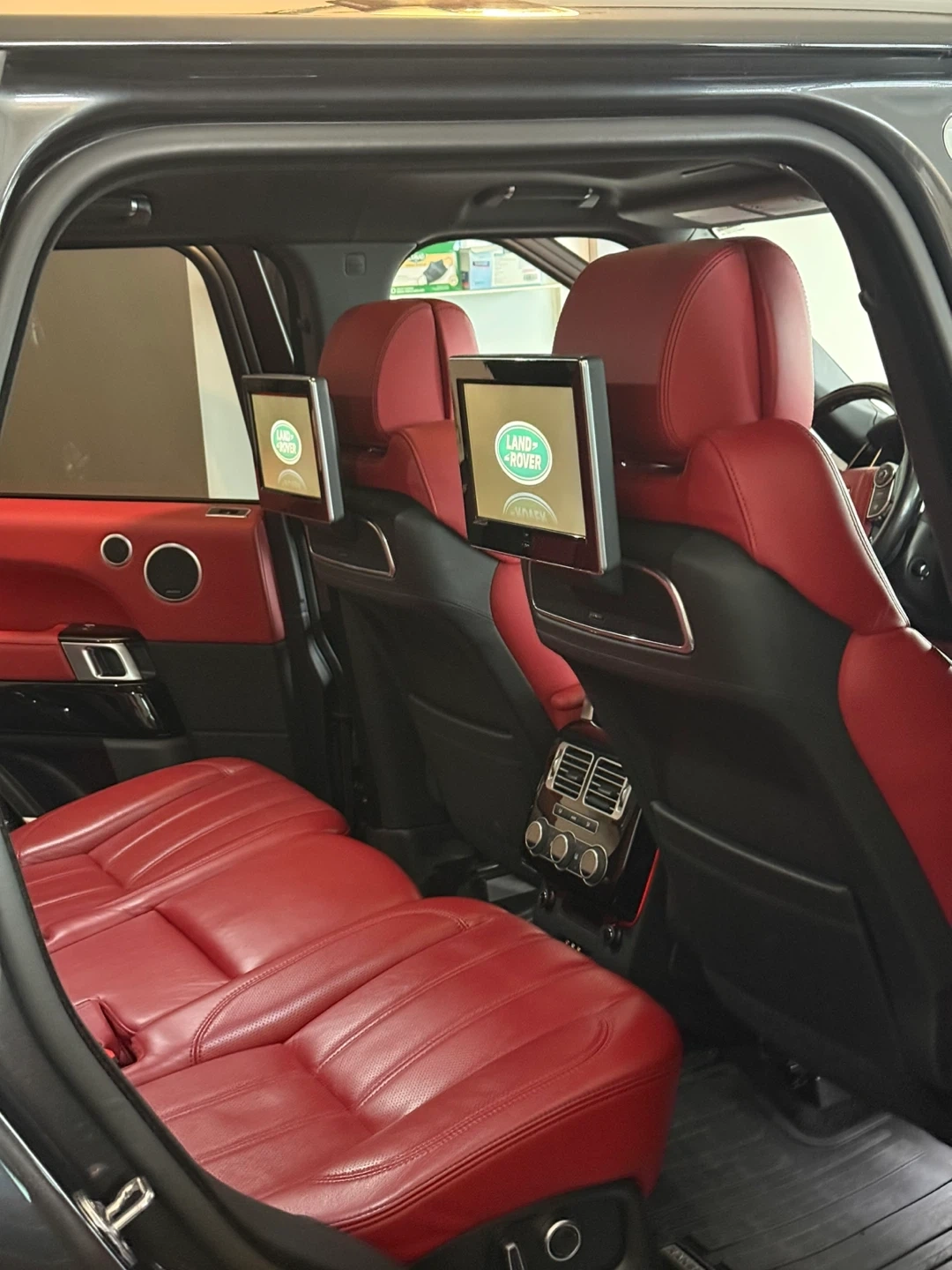 Selling a Range Rover autobiography year (2016)rear seat entertainment system. It comes with two screens mounted on the back of the front seats. The interior is red and black.